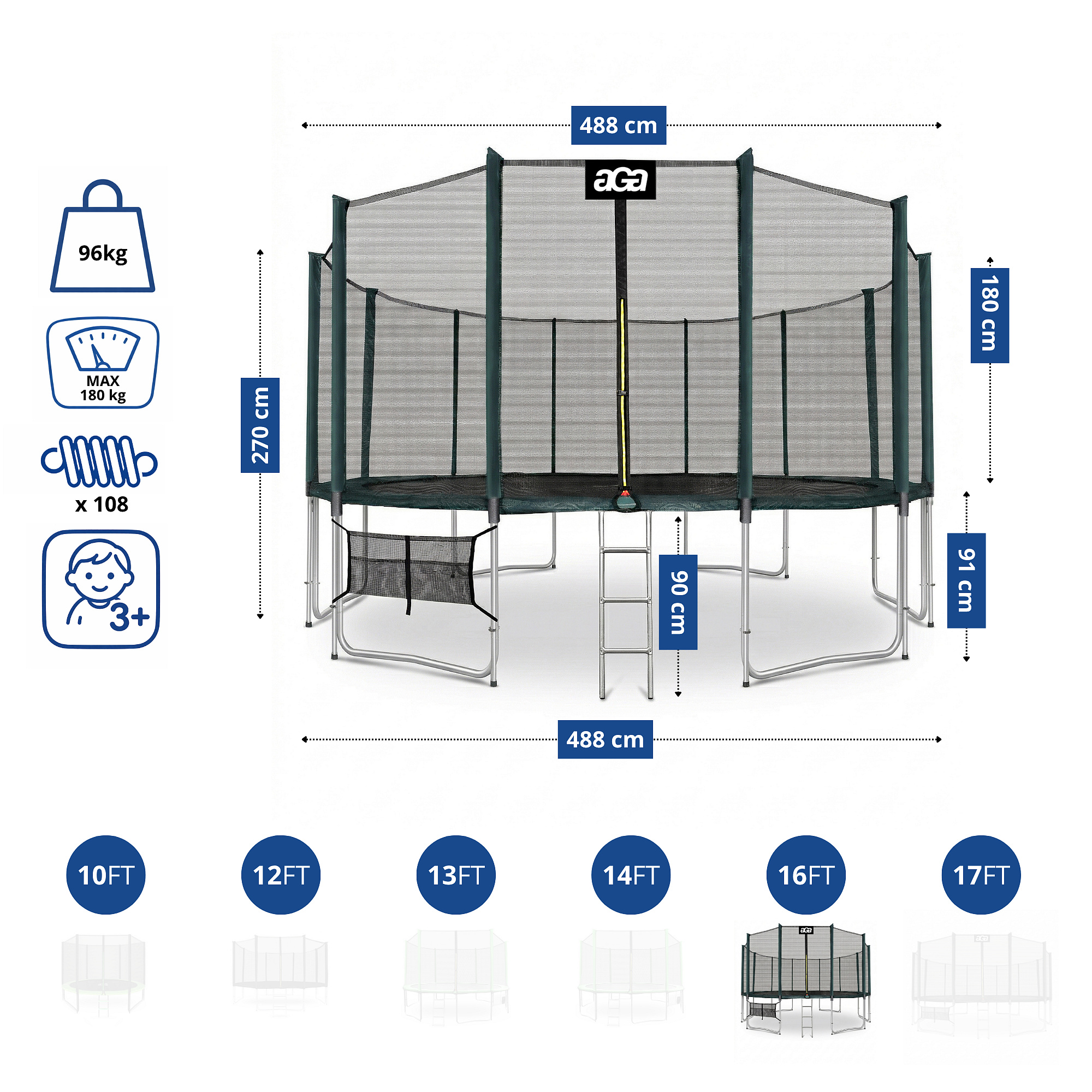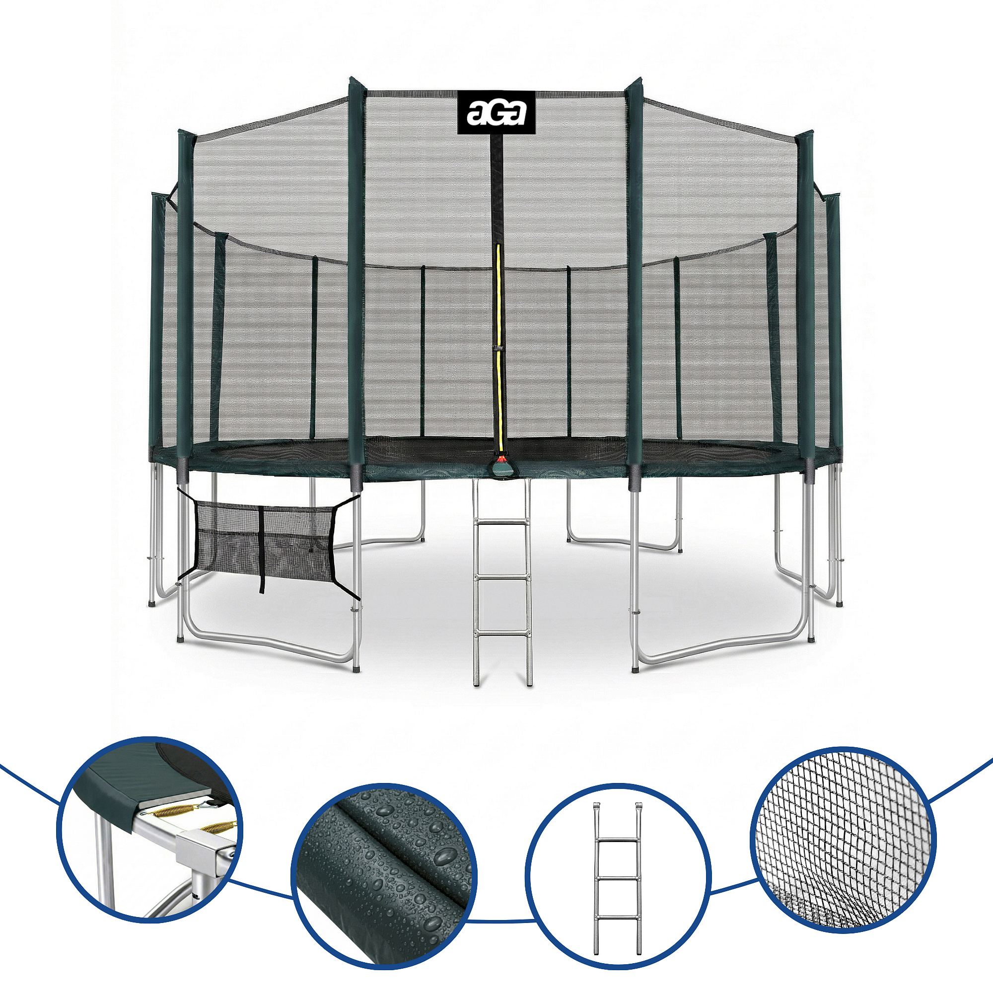 Specifications of the Aga SPORT PRO 488-500 cm Dark Green Trampoline with Safety Net.