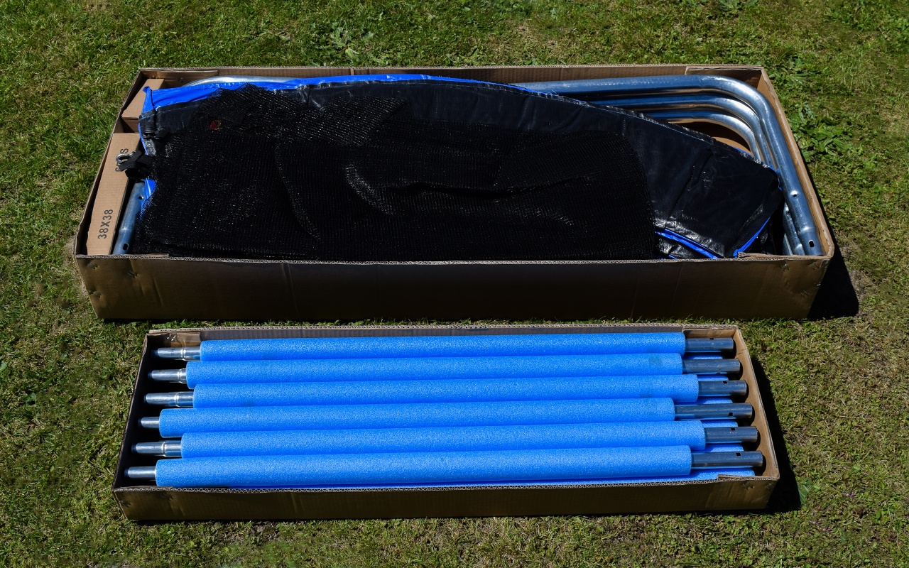 The trampoline's bouncing surface is made of polypropylene fabric (PP Mesh) with a water resistant surface and UV resistance.