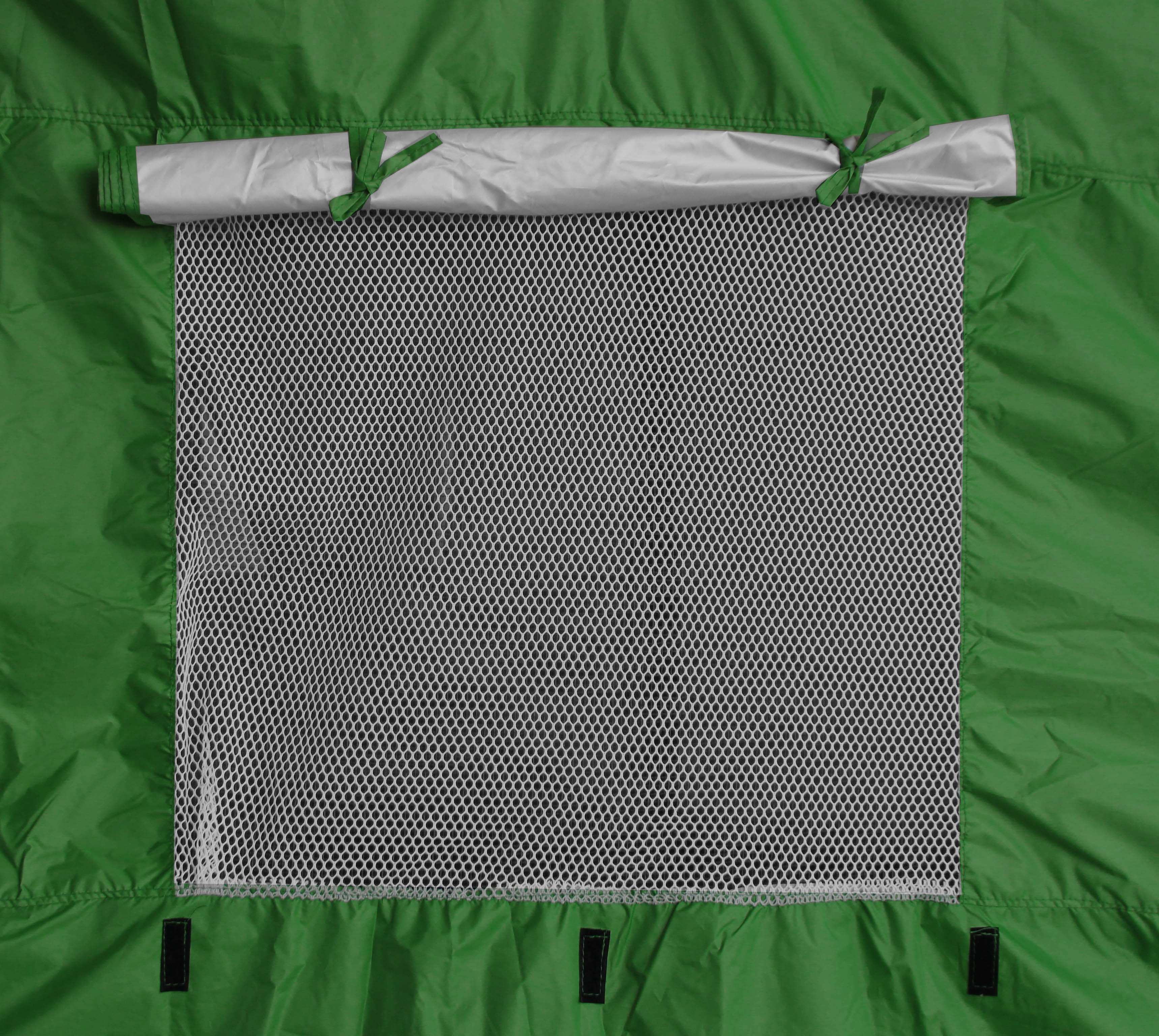 The tent is equipped with ventilation openings fitted with retractable blinds and insect nets.