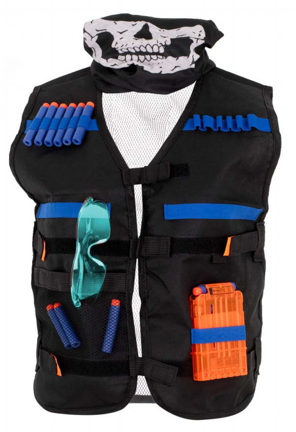 Vest made of durable material. It has Velcro straps and additional storage space for necessary accessories. Includes: vest, scarf, goggles, 20 darts, magazine and bracelet. Dimensions: 52x46 cm.Full description