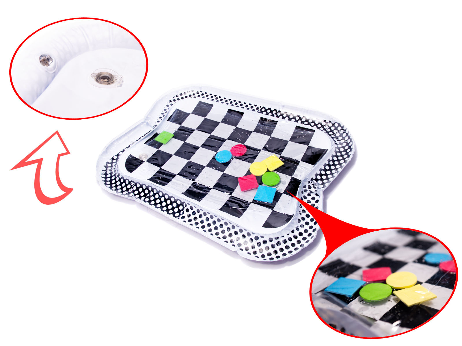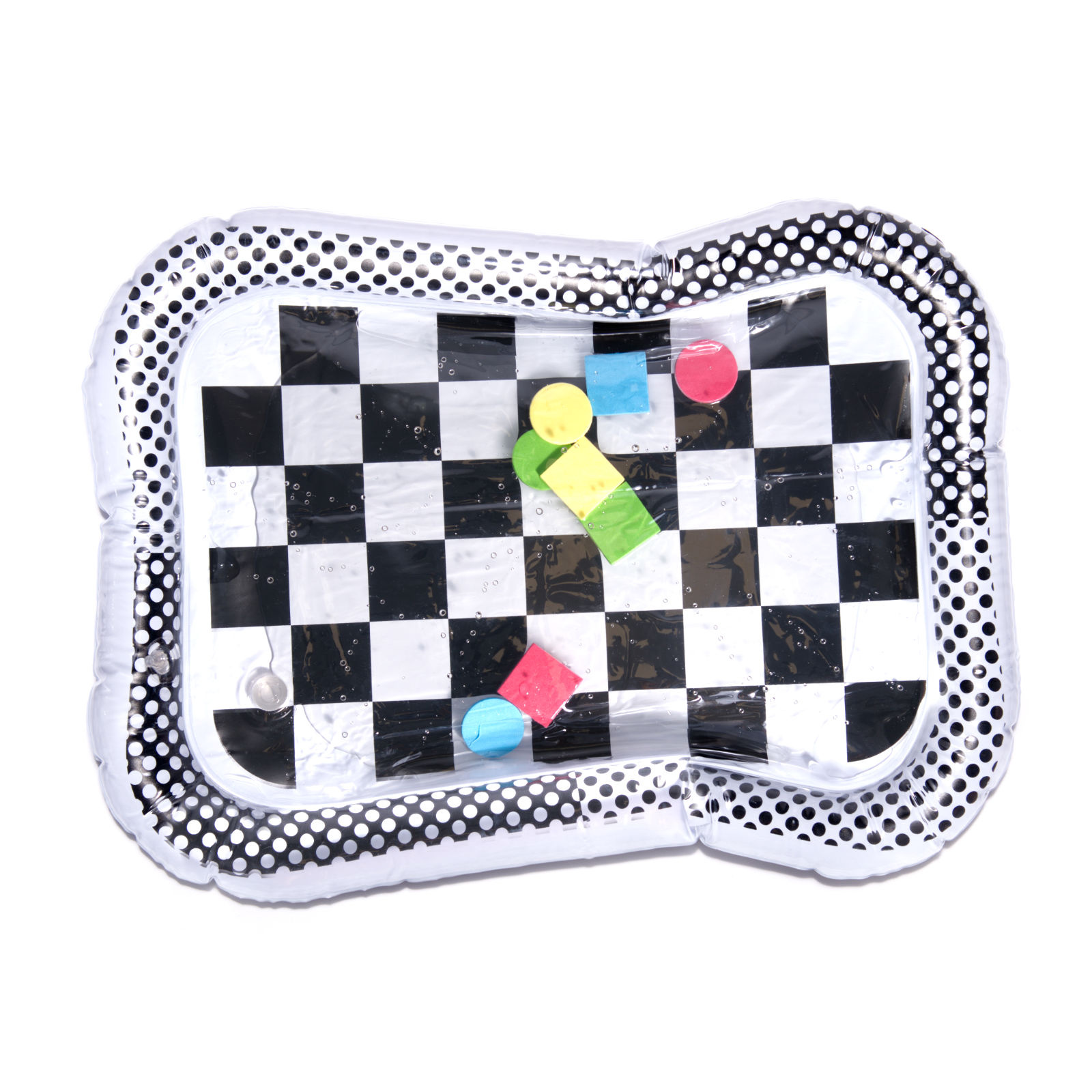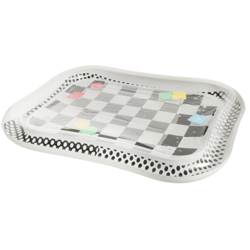 Amazing sensory mat for children with a contrasting black and white pattern. Inside the mat, there are colorful geometric shapes that move when the child moves. Floating elements will captivate and hold the child's attention. The edge of the mat should be inflated with air, while the center is filled with water. For better results, the center can be partially filled with water and partially with air.