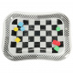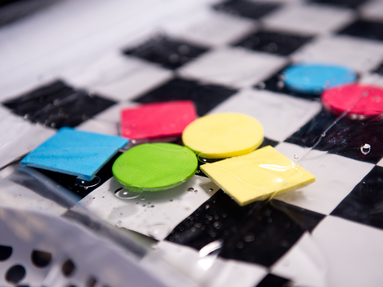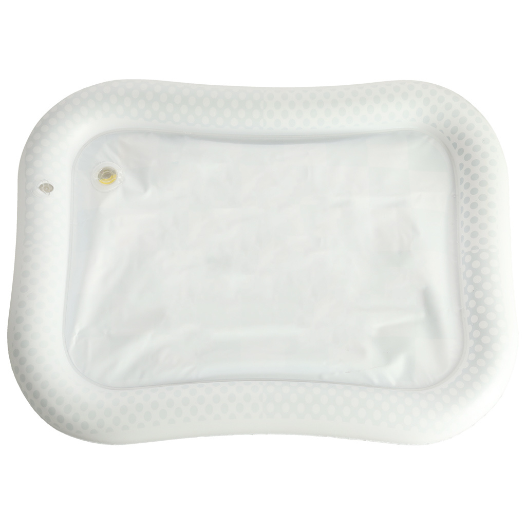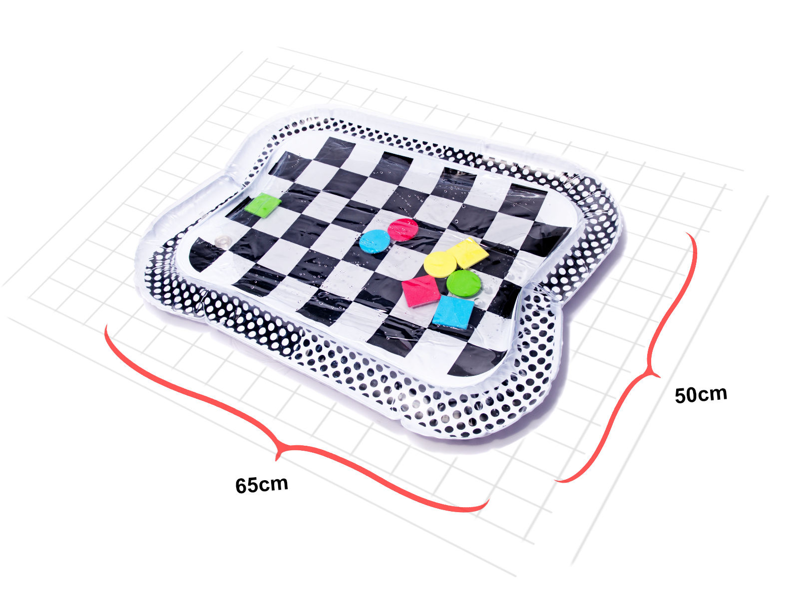 Amazing sensory mat for children with a contrasting black and white pattern. Inside the mat, there are colorful geometric shapes that move when the child moves. Floating elements will captivate and hold the child's attention. The edge of the mat should be inflated with air, while the center is filled with water. For better results, the center can be partially filled with water and partially with air.