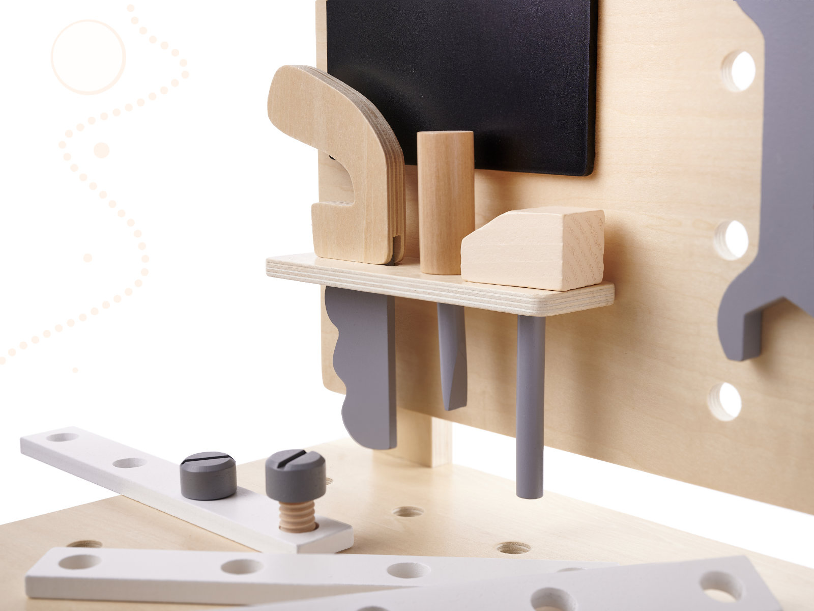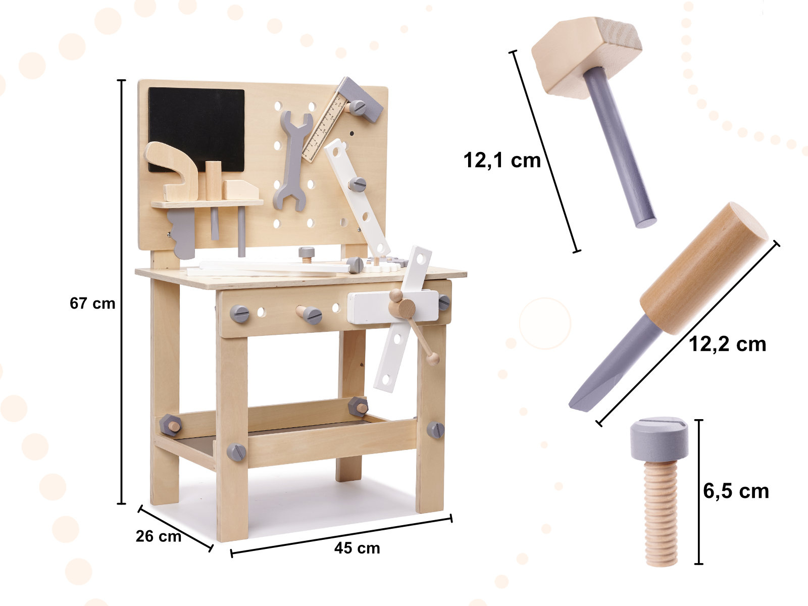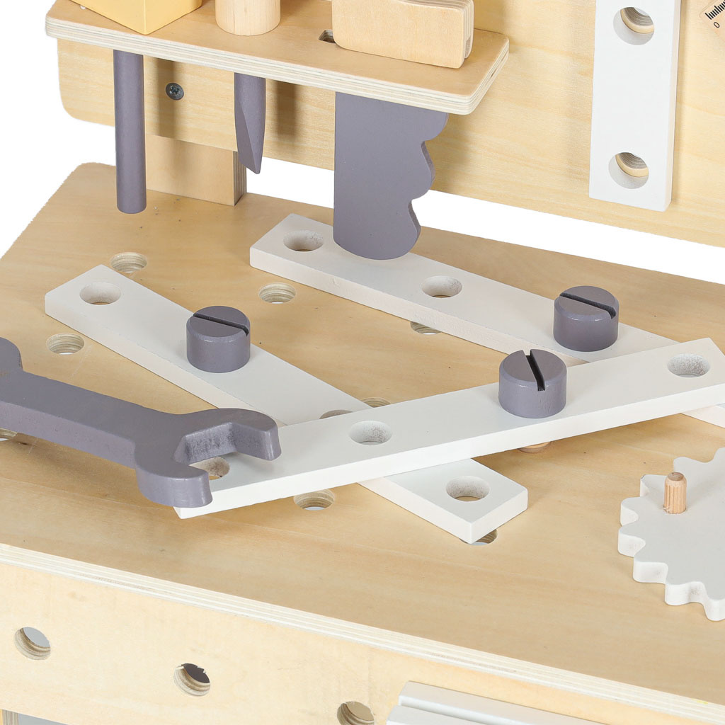The children's workshop with tools is a great educational toy for little DIYers. It teaches the child to distinguish shapes and colors, helps to improve manual dexterity and dexterity, develops the child's imagination and concentration.