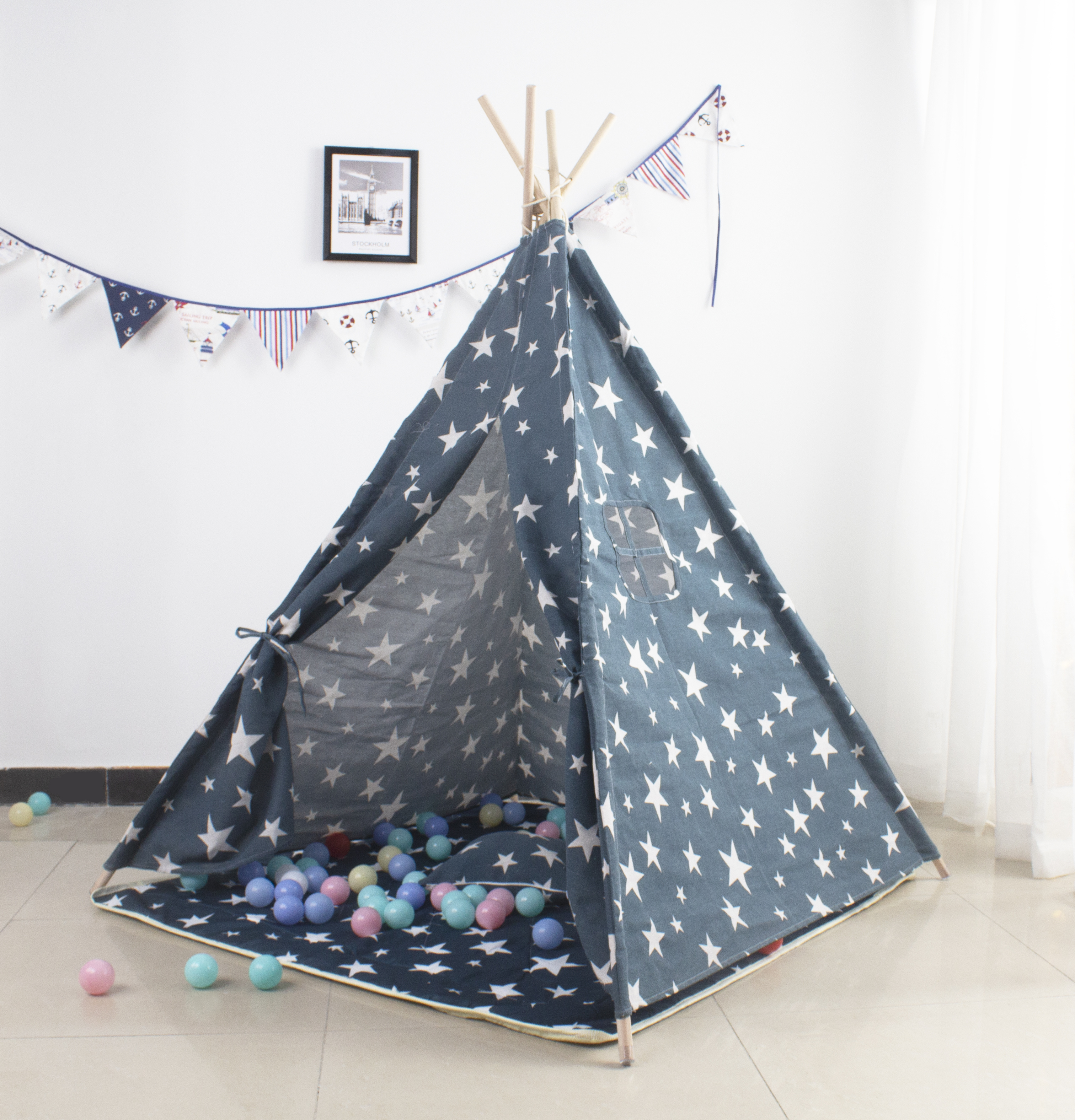 This tent will provide children with a cozy corner for their play.The tent frame consists of four poles, each 180 cm long.
