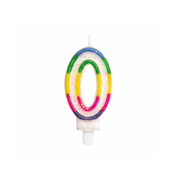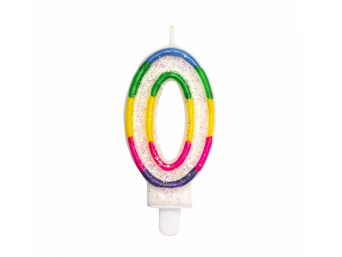 The glittering candle number "0" with a rainbow edge is a perfect cake decoration.