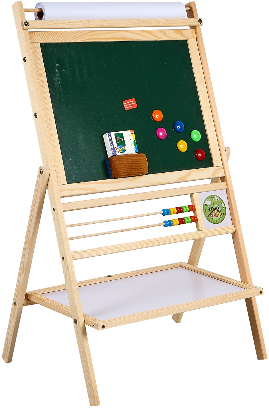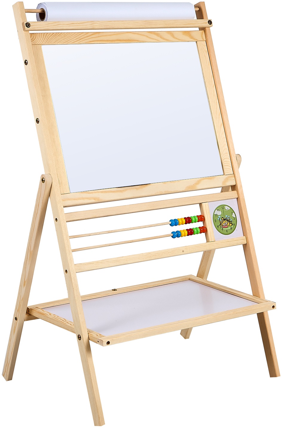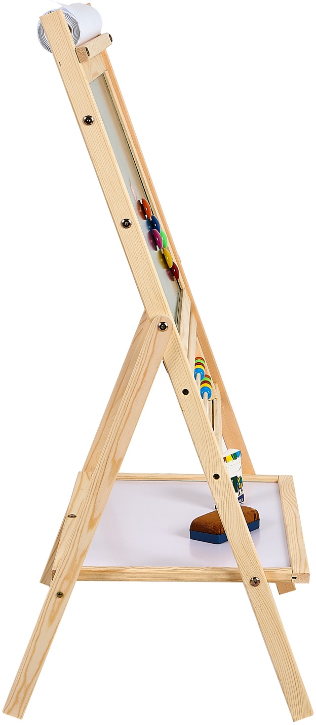 Double-sided children's magnetic whiteboard with storage shelf and 20 metre roll of paper, from Aga4Kids.