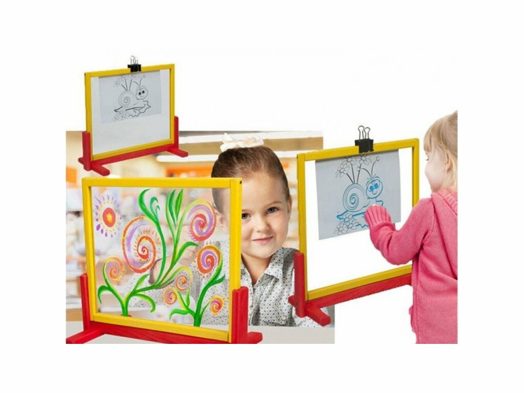 - The set includes - a transparent board with safety glass, a clip for attaching a picture, coloring pages for tracing, and a marker