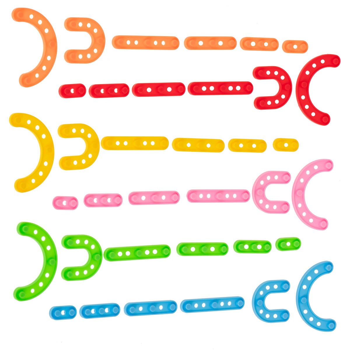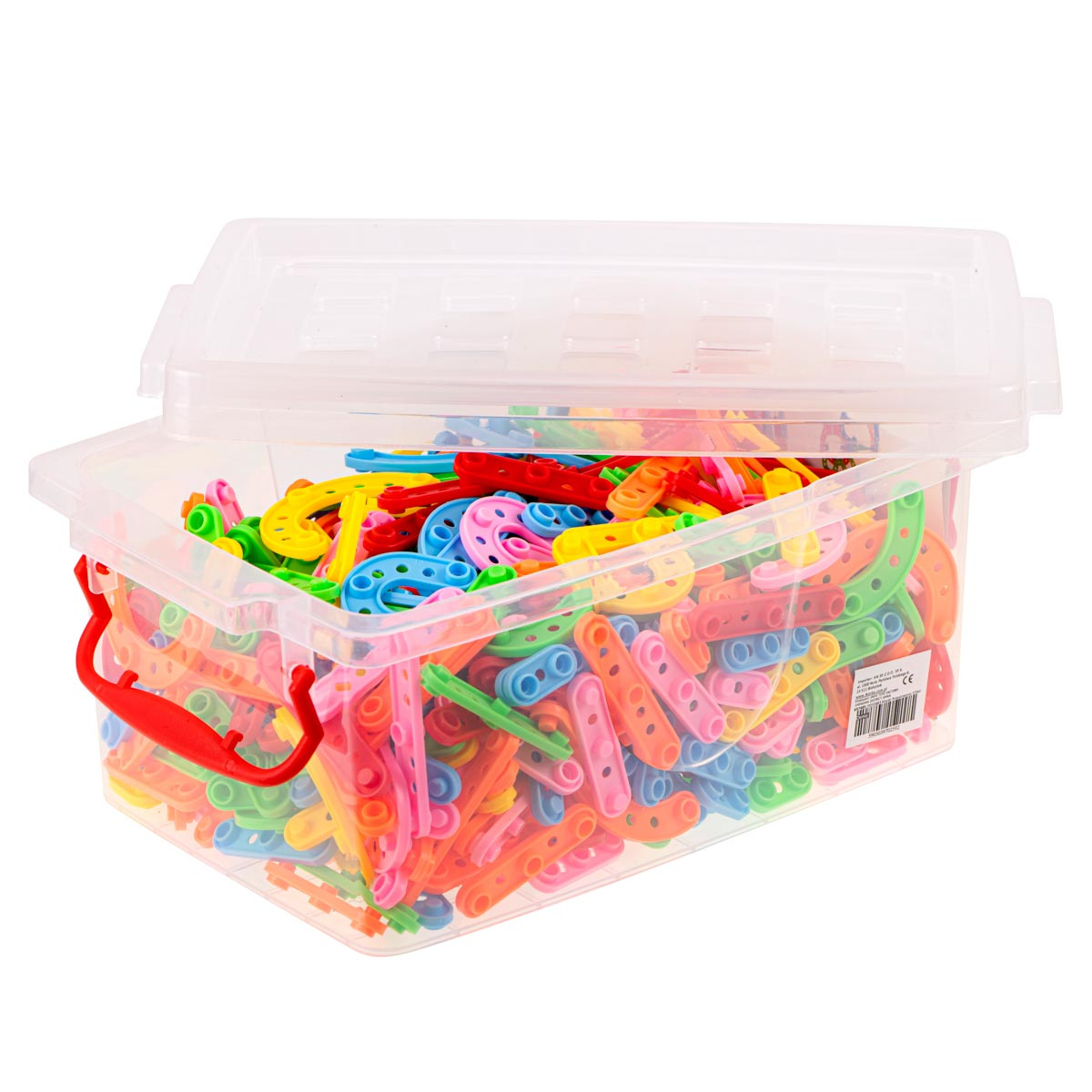 Let your child become a little engineer. Large set of multi-coloured building blocks made of plastic, resembling flat bars.
