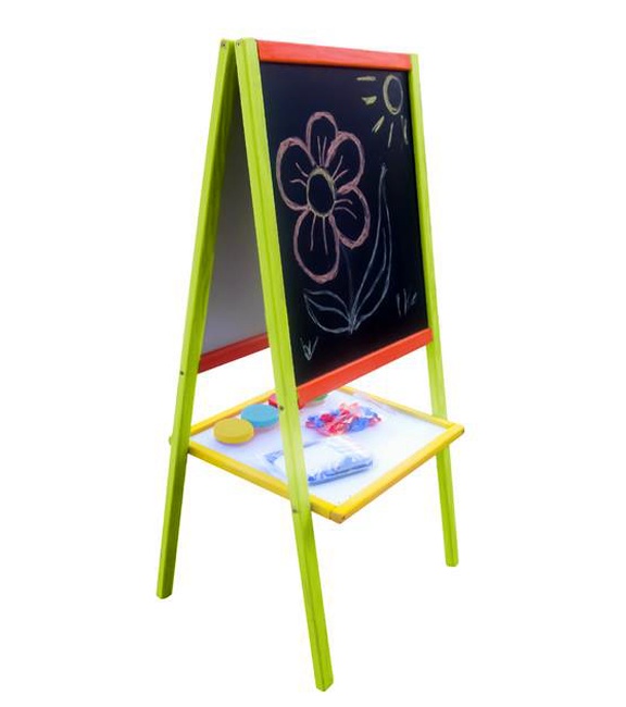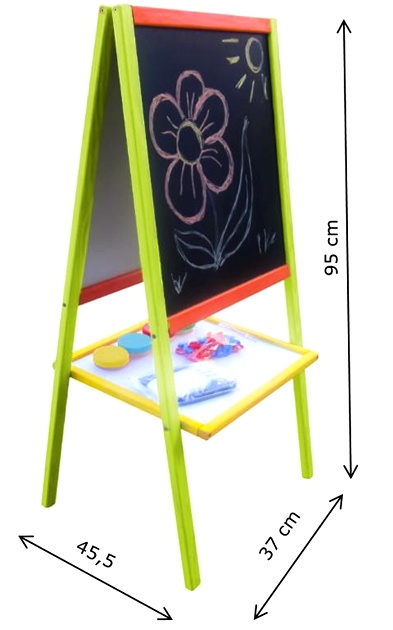 Children can draw on the blackboard with classic chalk and on the other, white one, with colored markers.