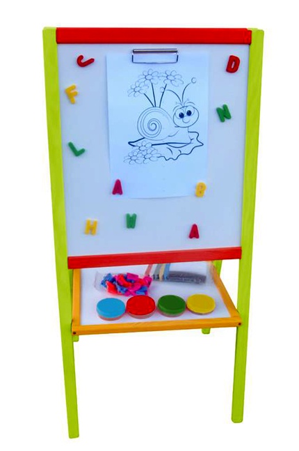 Double-sided children's magnetic board with a storage shelf, in a colorful frame, from the company Aga4Kids.