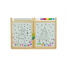 On the blackboard, children can draw with classic chalks, and on the other, white one, with colored markers or on paper with crayons.