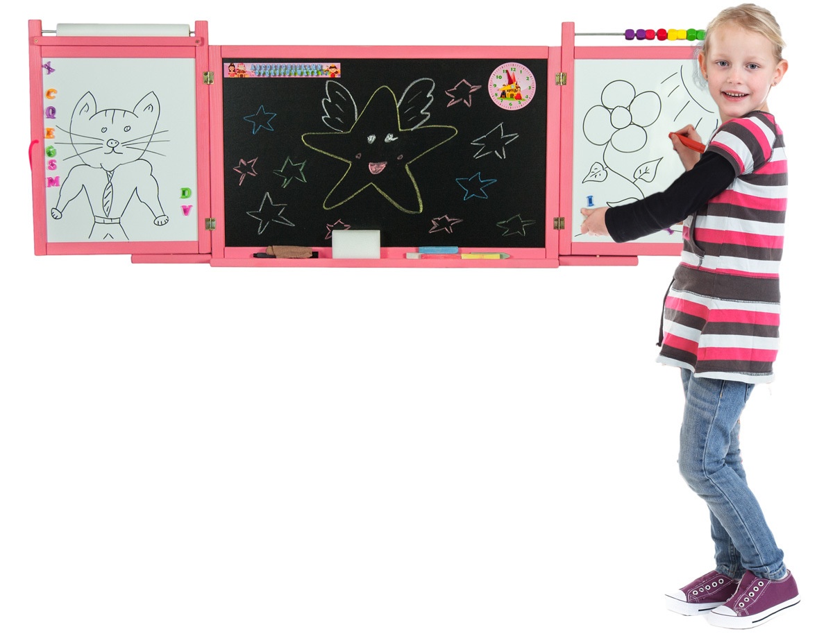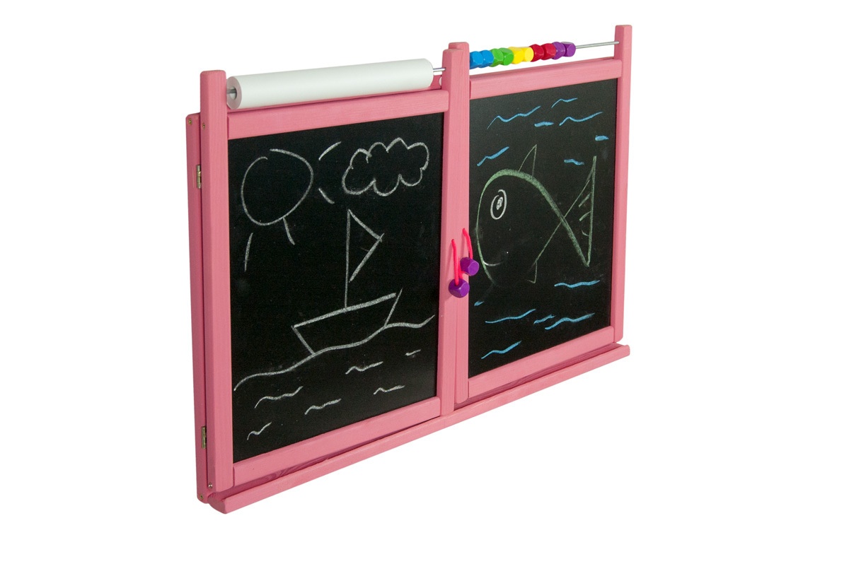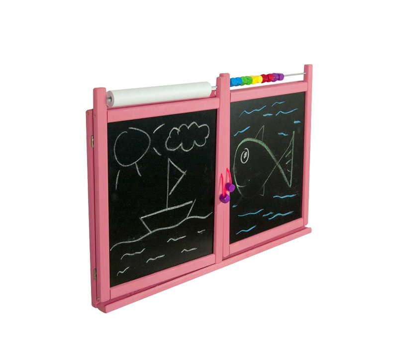 On the blackboard, children can draw with classic chalks, and on the other, white one, with colored markers or on paper with crayons.