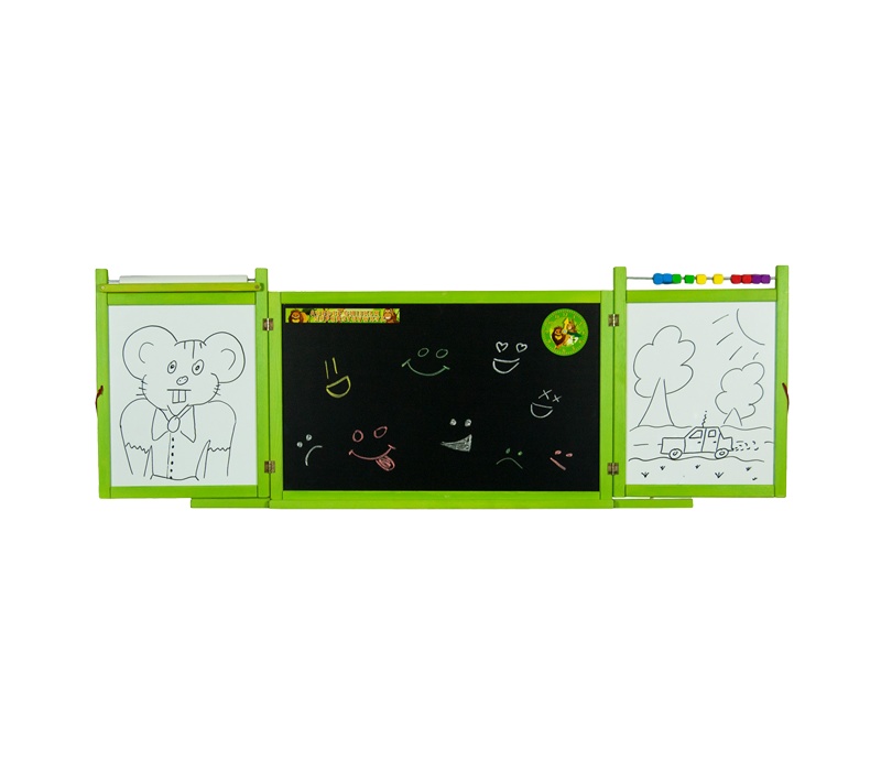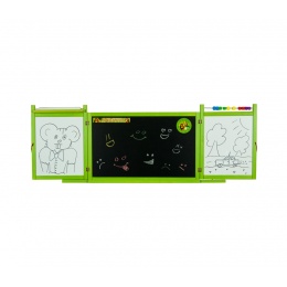 On the blackboard, children can draw with classic chalks, and on the other, white one, with colored markers or on paper with crayons.