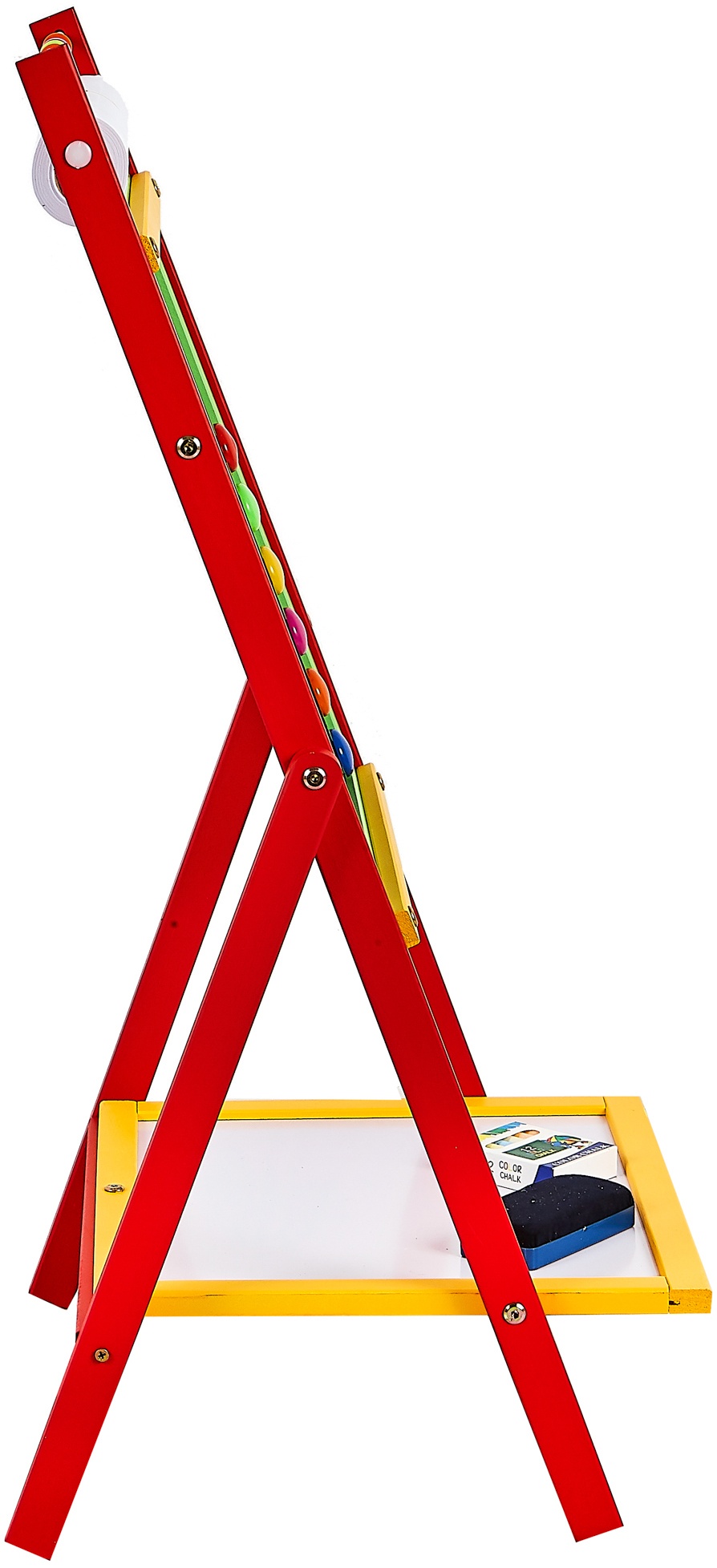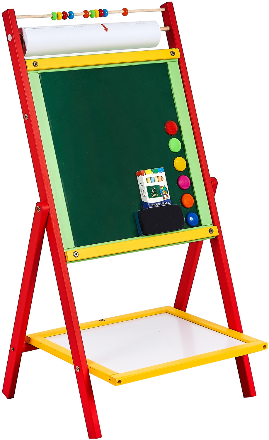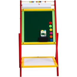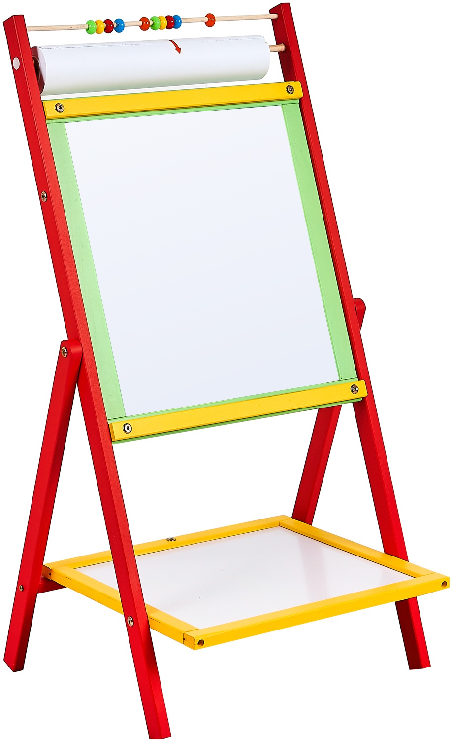 Double-sided children's magnetic whiteboard with storage shelf, counter and interchangeable 20 metre roll of paper, from Aga4Kids.