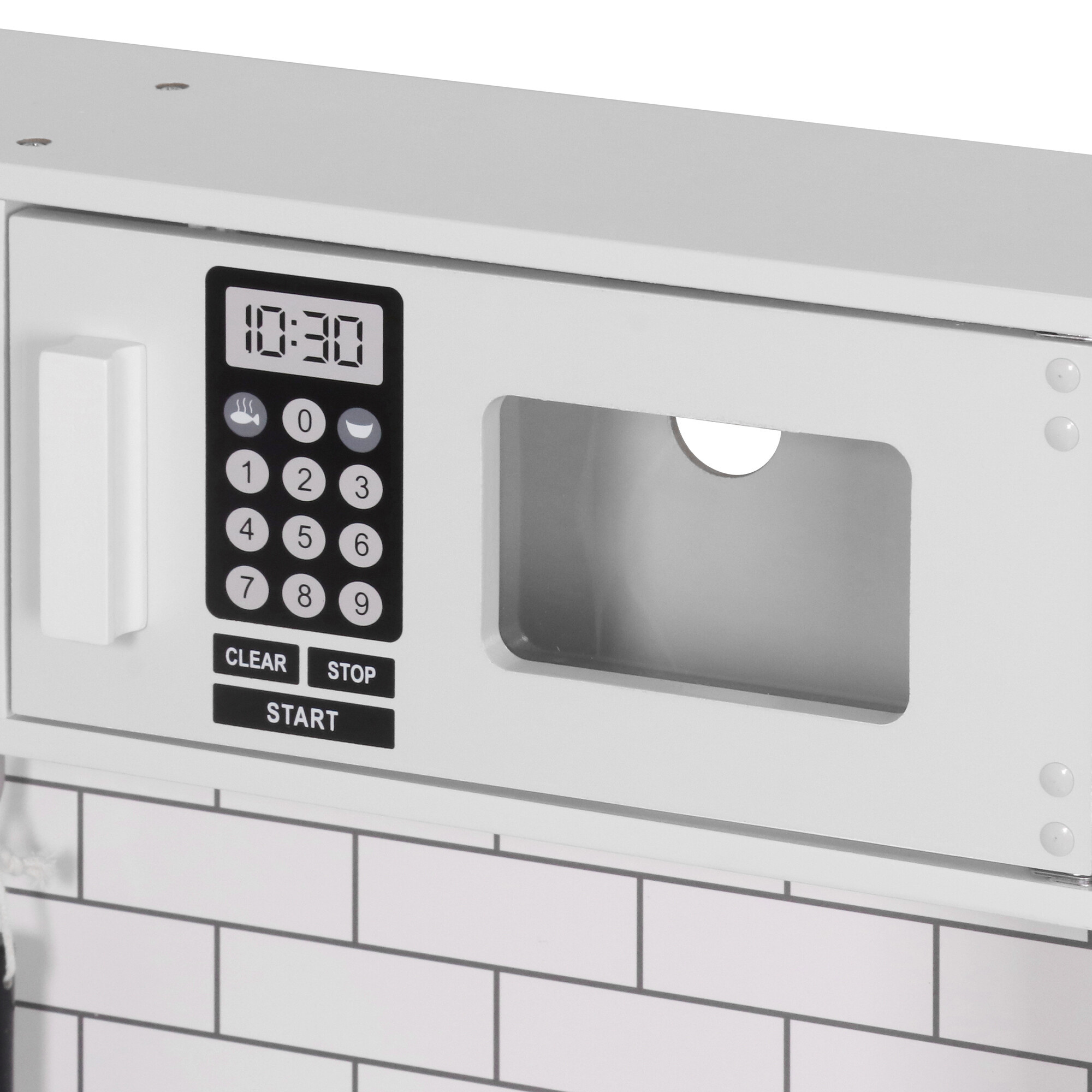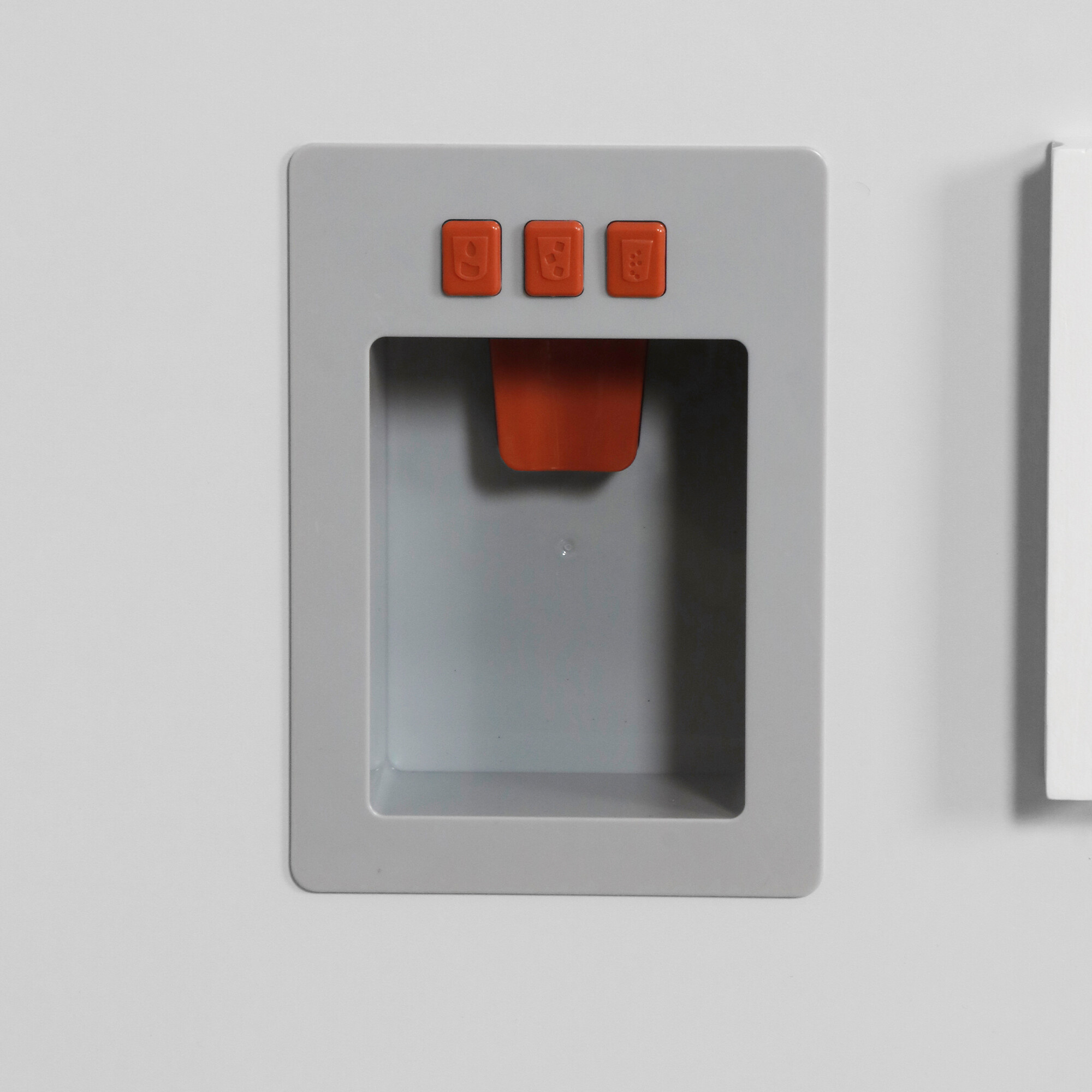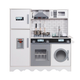 The modern design of the play kitchen is complemented by electronic features that further enliven the game. Children can use the ice maker with light and sound effects, an electric hood, a microwave oven, and stoves that light up and make realistic sounds when turned on. A major attraction is also the electric flowing sink with a light effect, allowing children to mimic real dishwashing. The entire set is completed with a washing machine that lights up and makes washing sounds, allowing children to try out other household activities.