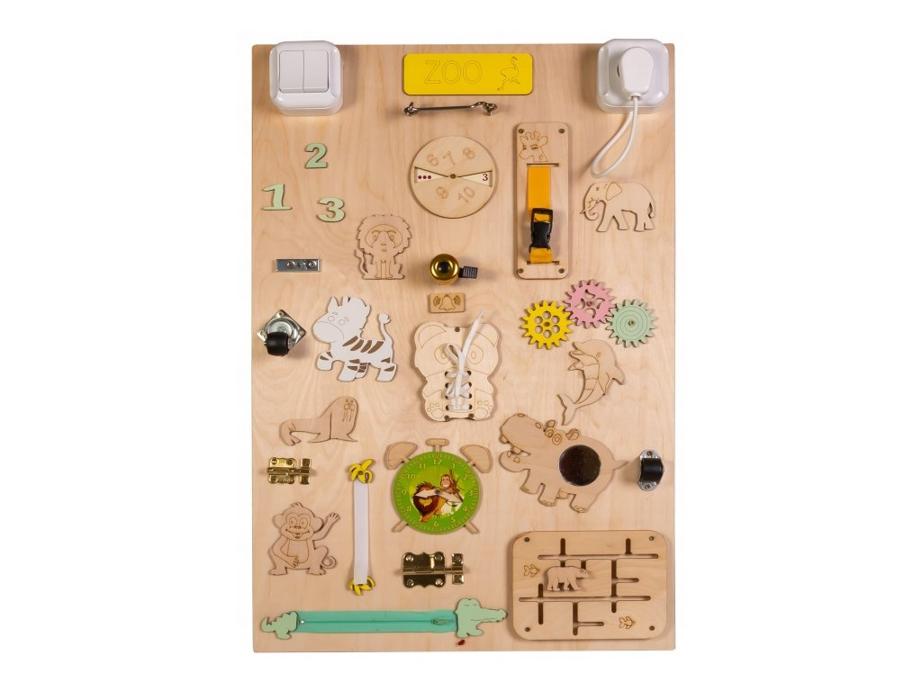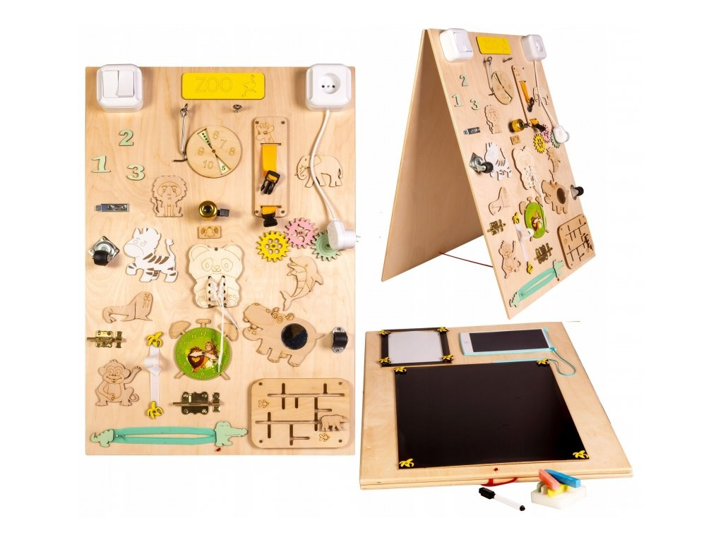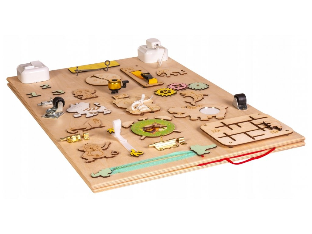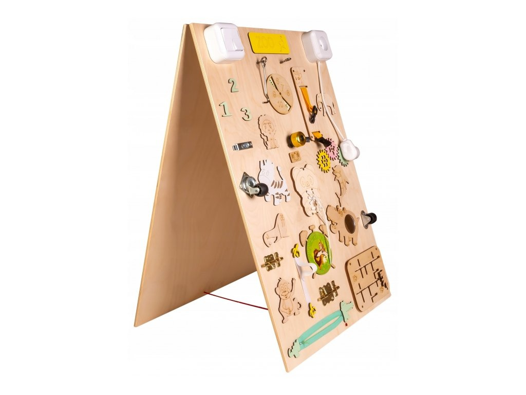 On one side of the board, little hands discover stimuli to encourage logical thinking. Shoelaces are an accessible way to learn to tie, a classic zipper will encourage creativity.