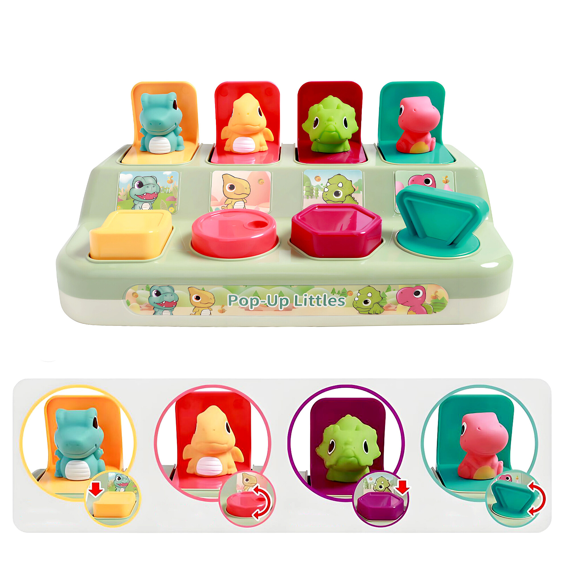 The toy has four cute dinosaur figures that hide inside and wait for the toddler to help them get out. When a child presses, switches, or turns any of the interactive elements, one of the animals pops up.