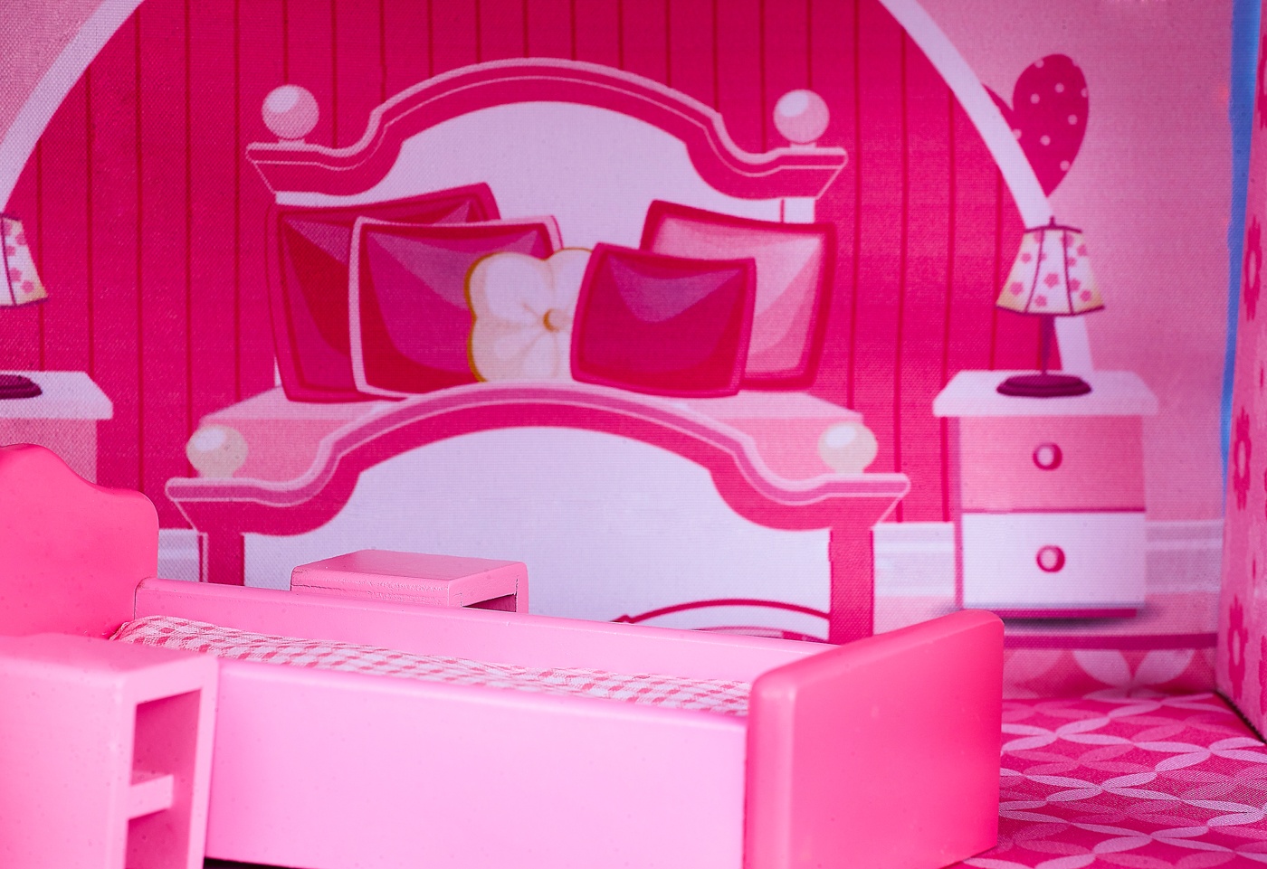 Dollhouse has three levels of floors. There are five rooms in the house, which are furnished and decorated each in a different style.