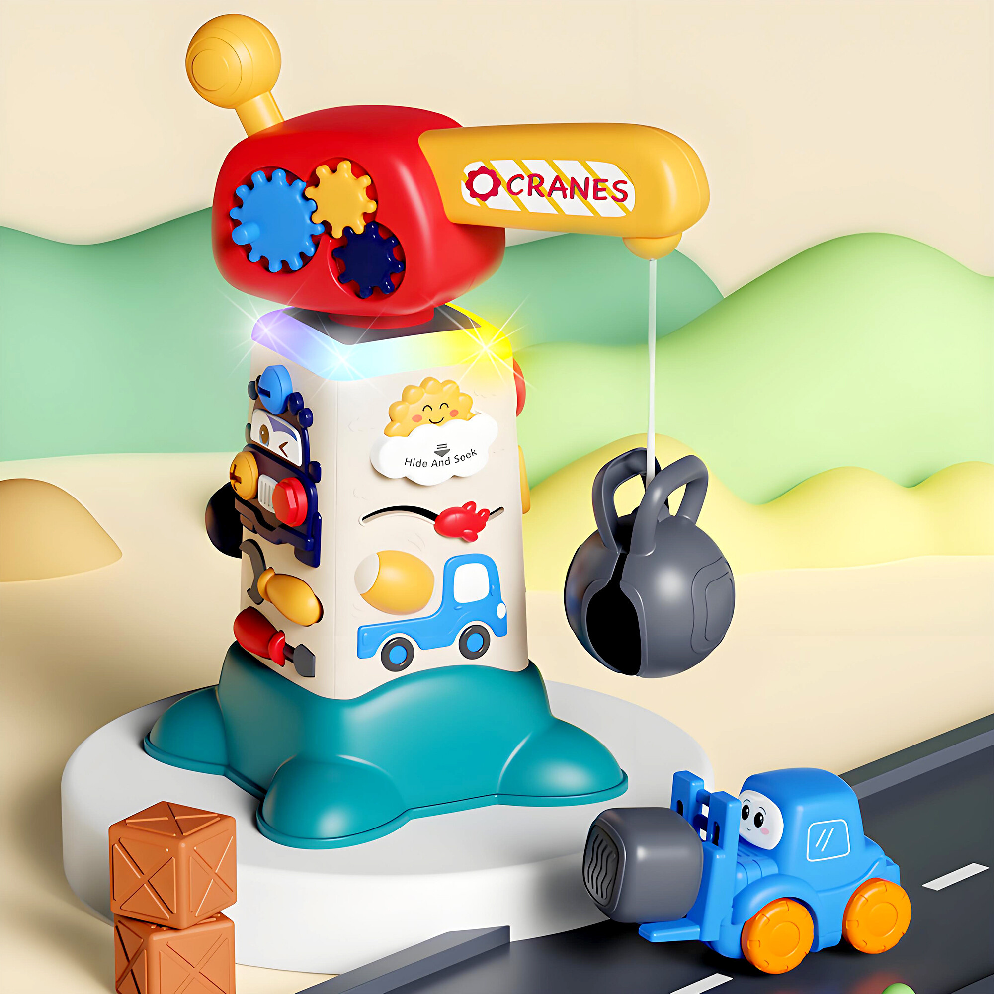The interactive crane is equipped with many features that support children's development. Each of the four sides of the crane offers unique activities that stimulate different senses and skills.