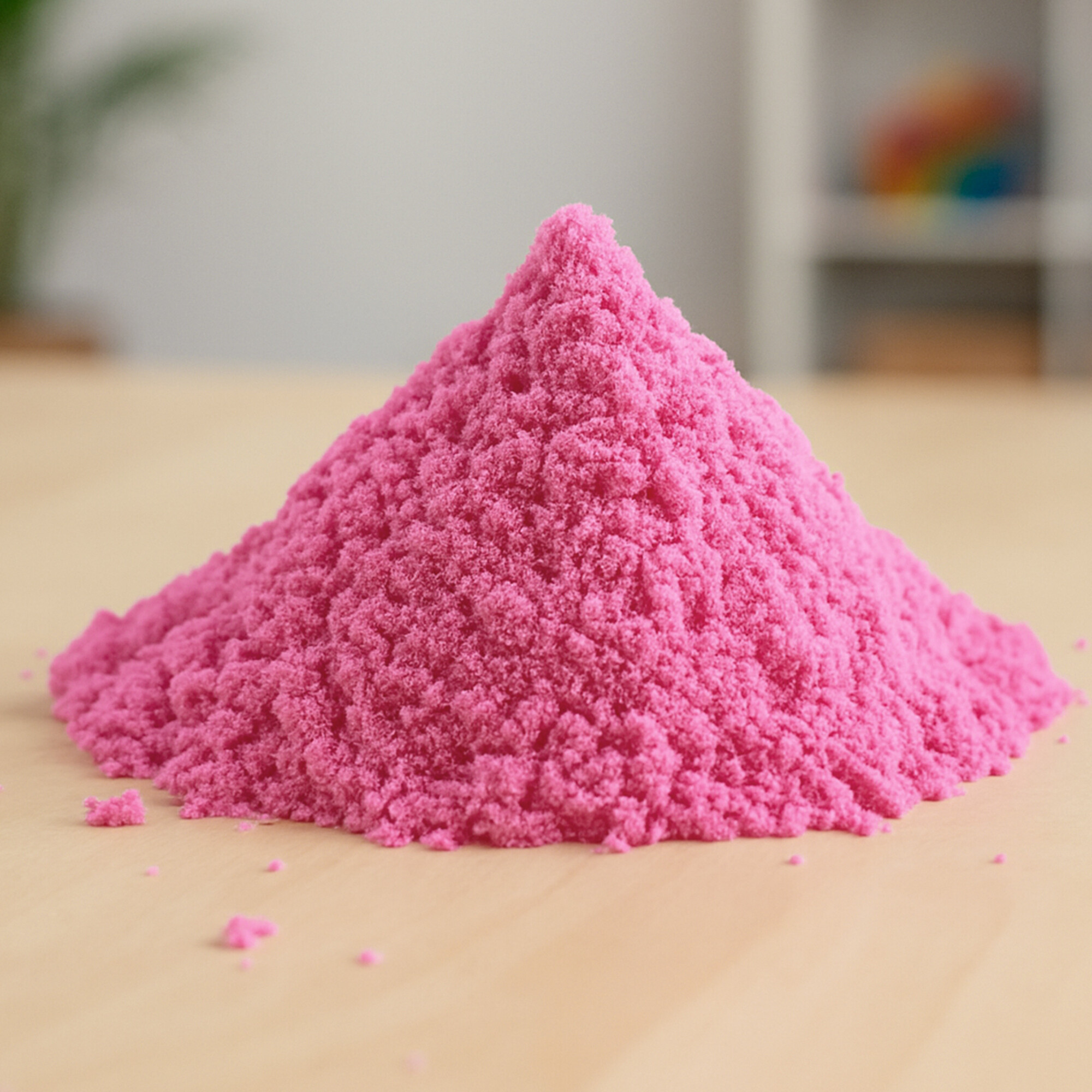 Kinetic sand is smooth, soft, and very pleasant to the touch. It is very well moldable and if compressed, it firmly holds its shape, like wet sand.