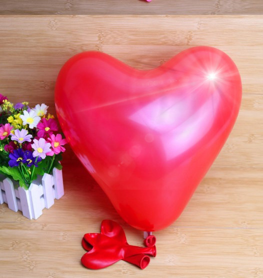 The inflatable balloon takes the shape of a heart when inflated and can be filled with helium or air.