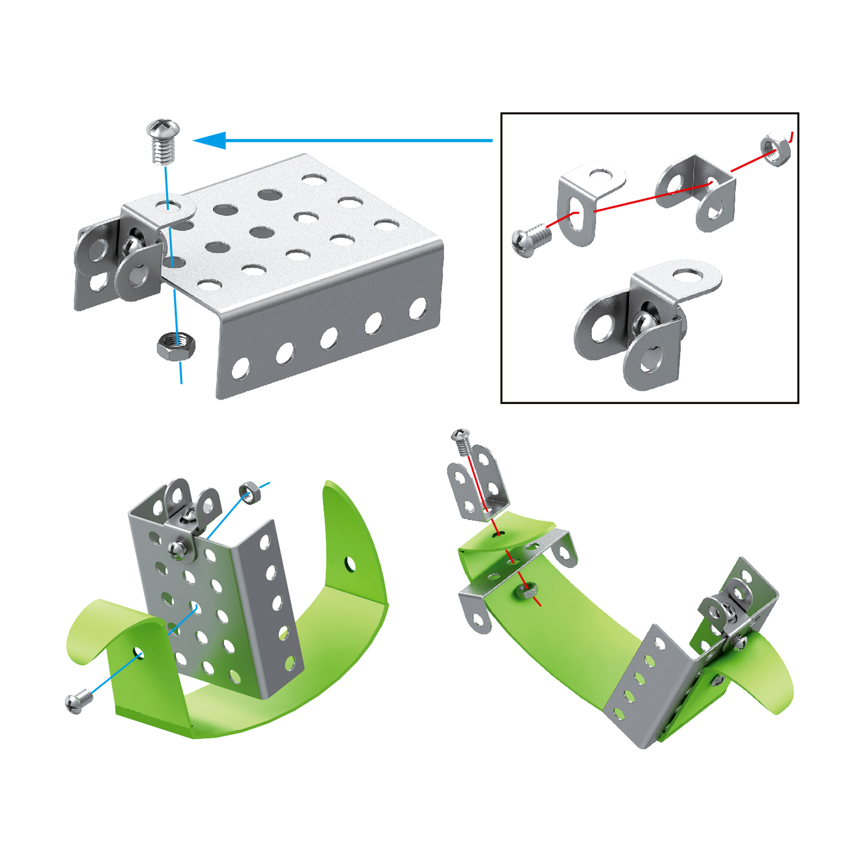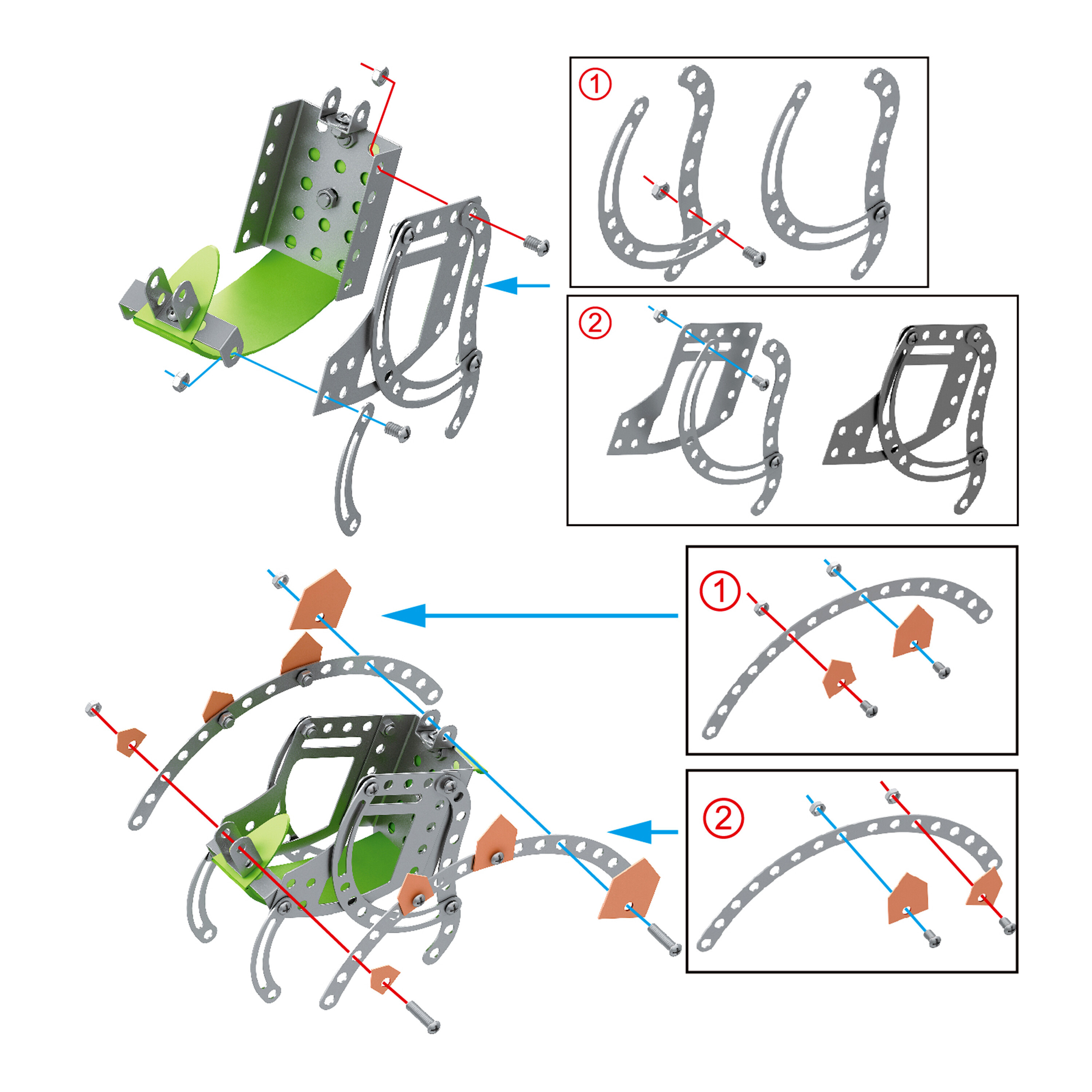 The construction is intuitive and simple thanks to the included instructions.The construction set contains 125 different pieces that can be connected using screws and nuts.