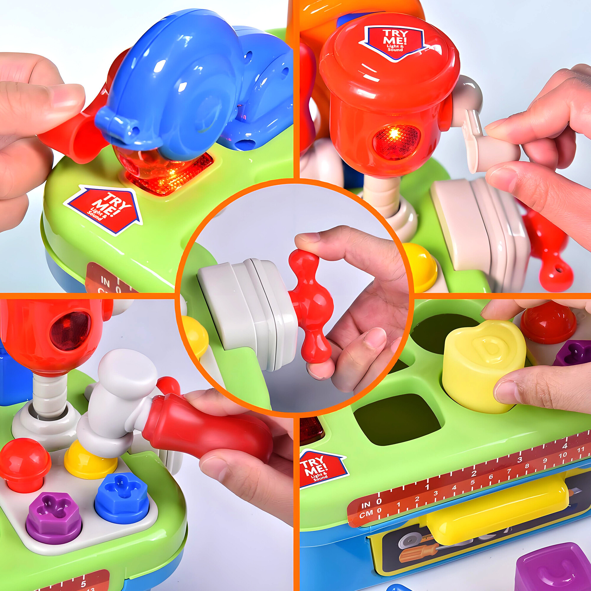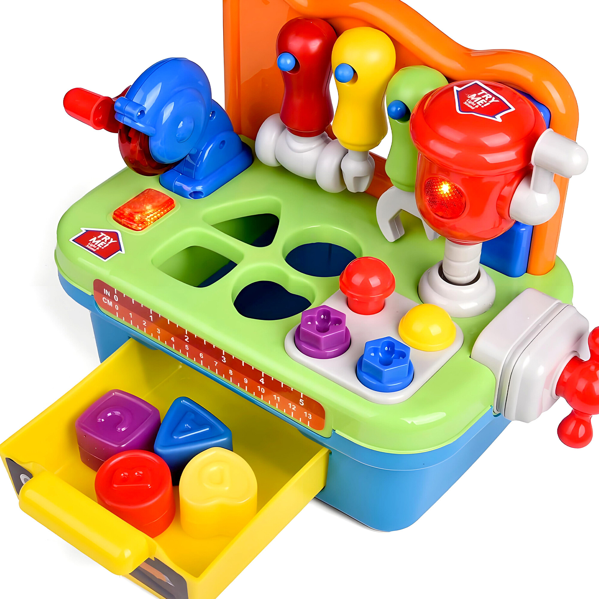In the equipment, find a rotary saw and a drill with light and sound, a vise, a pull-out drawer, and other tools. Furthermore, the table is equipped with sorting holes through which the included colored blocks can be inserted.