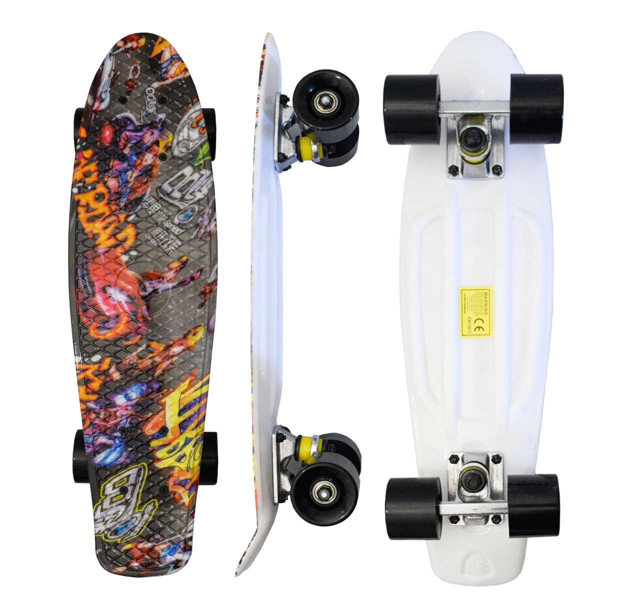 The skateboard is made of polypropylene (PP) plastic. The use of this type of material ensures higher durability and at the same time less weight compared to regular plywood skateboards.