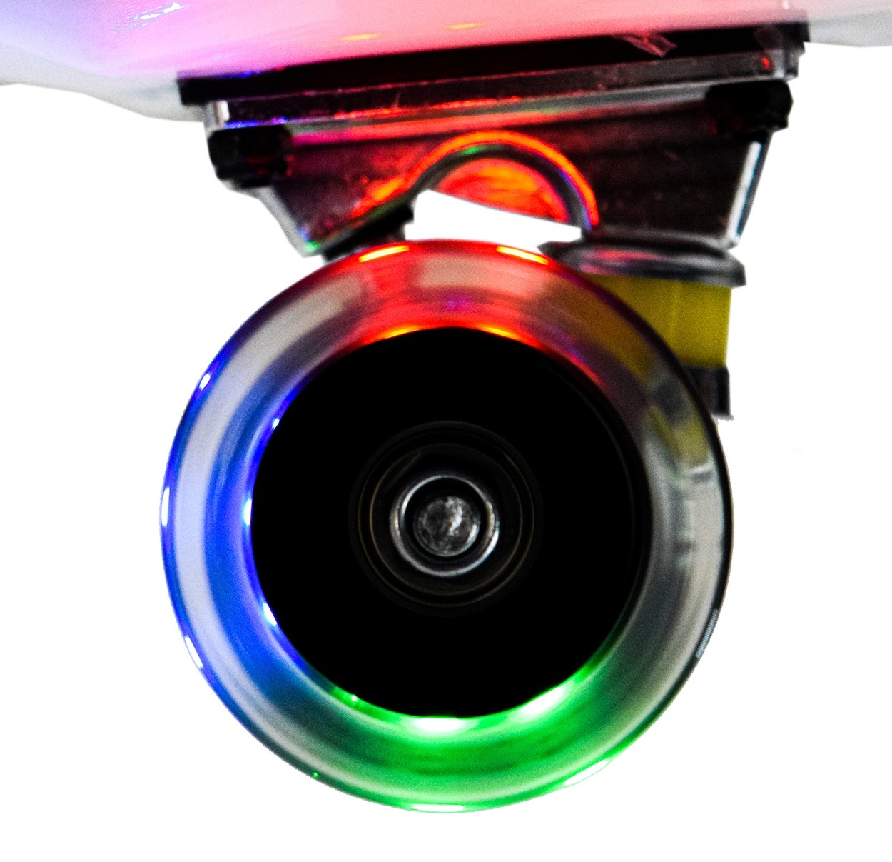 The skateboard is equipped with glowing wheels that begin to glow when set in motion.