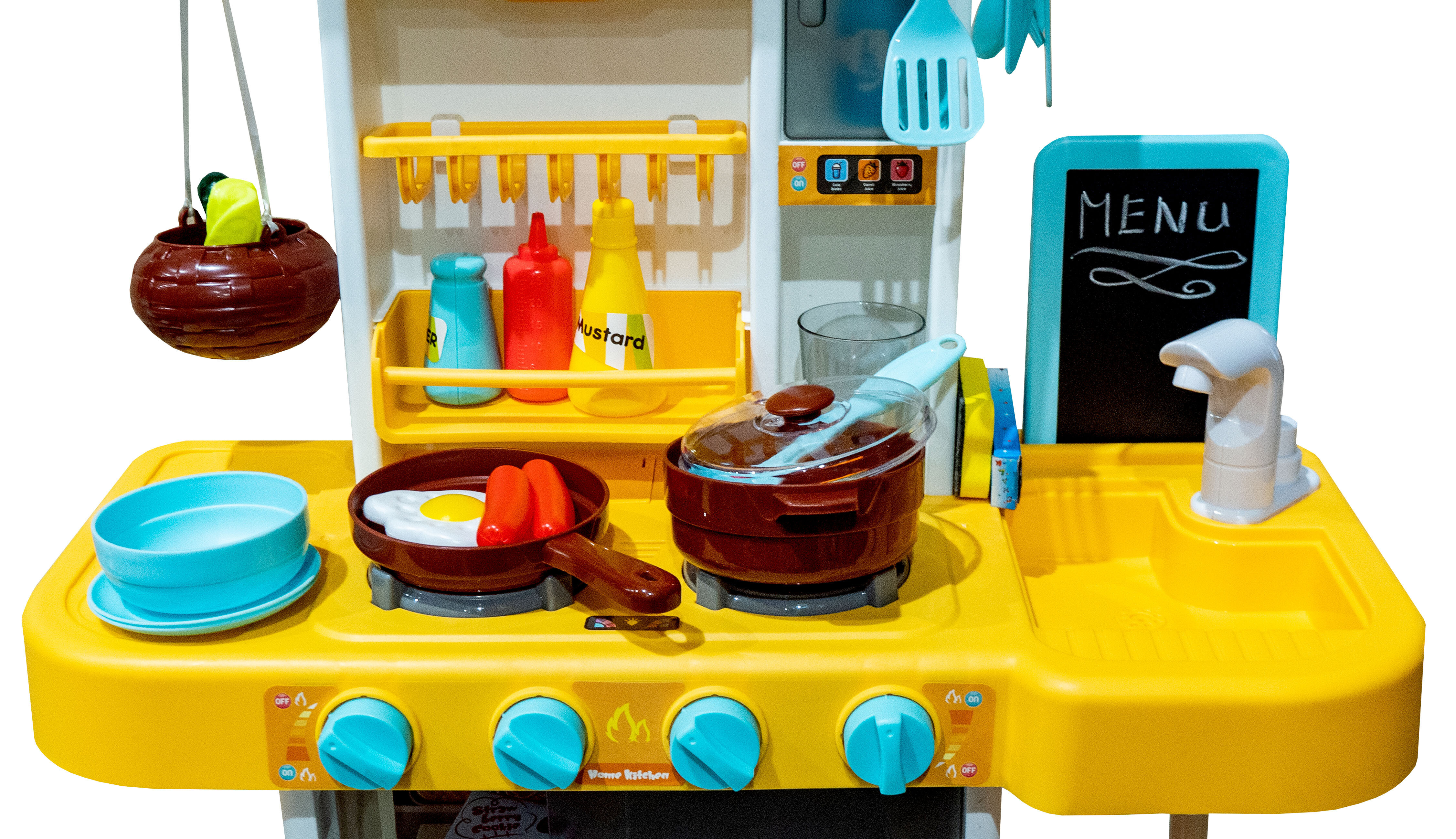 - Includes a variety of accessories such as a pot, pan, lids, plates, utensils, food, etc.