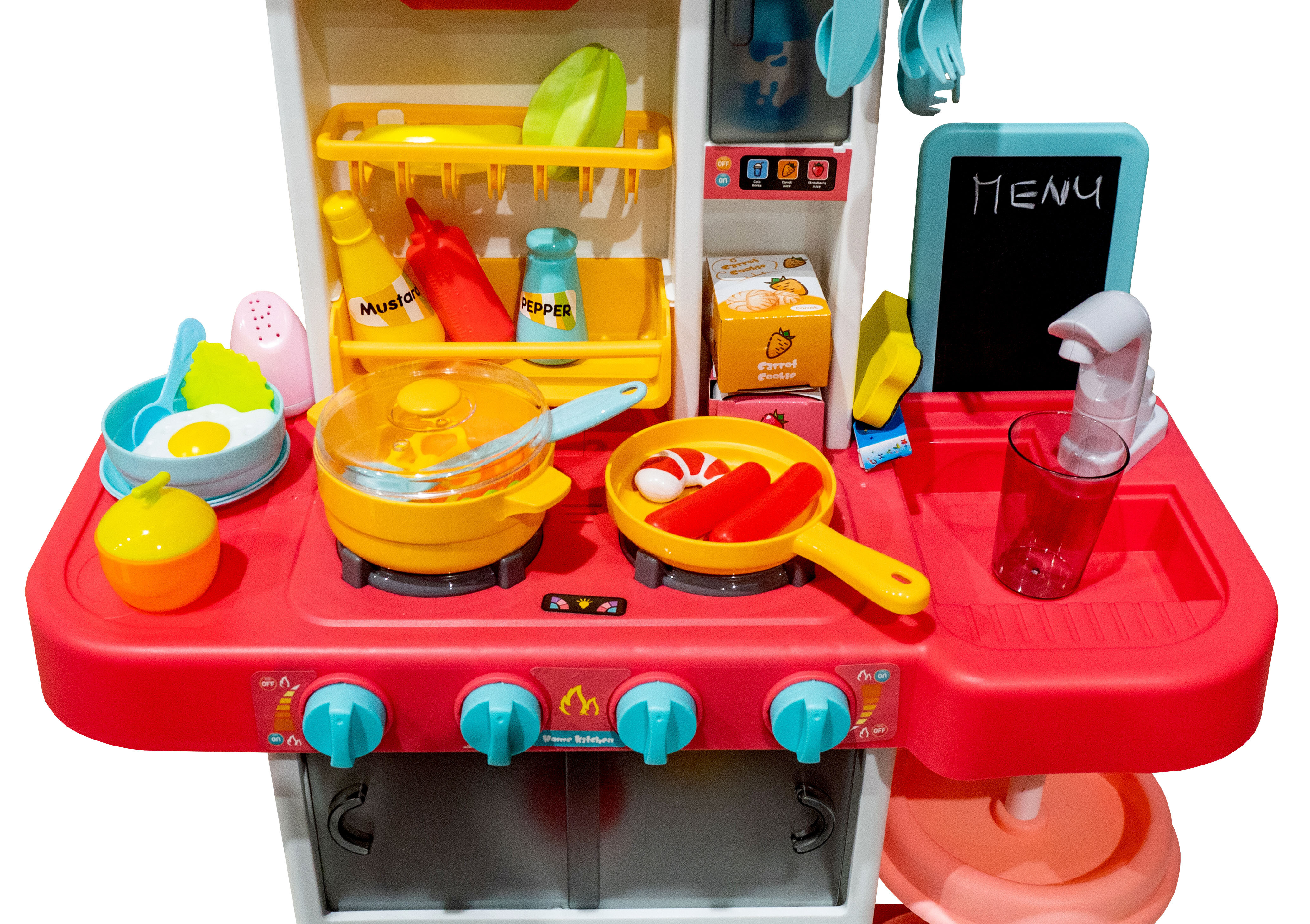 - Includes a variety of accessories such as a pot, pan, lids, plates, utensils, food, etc.