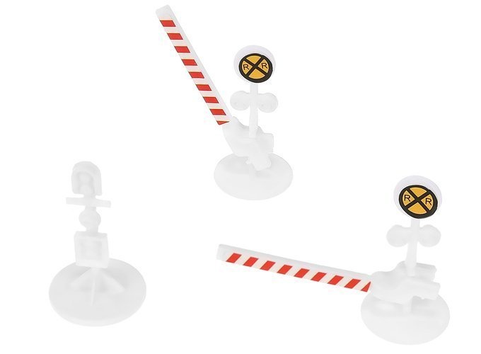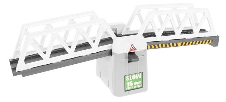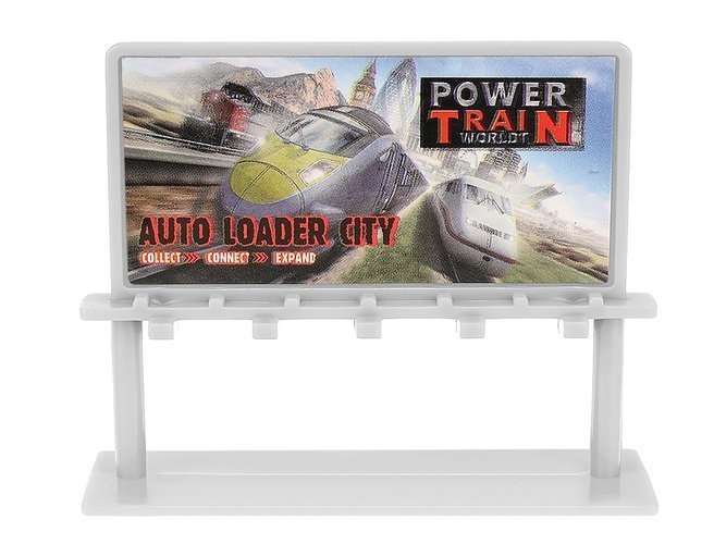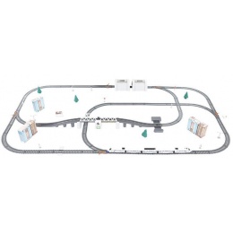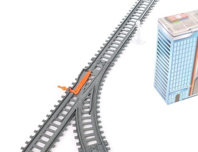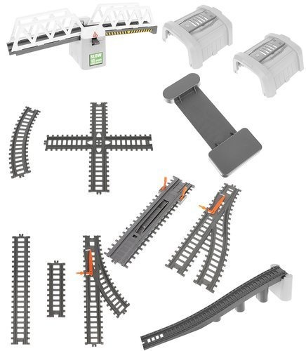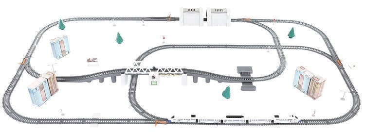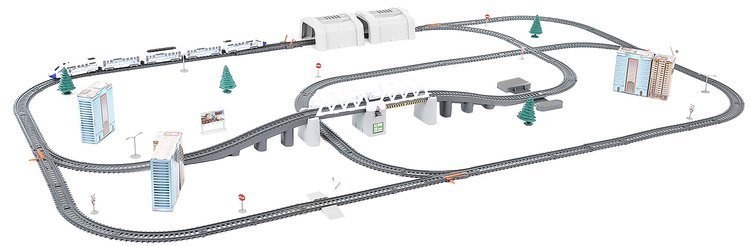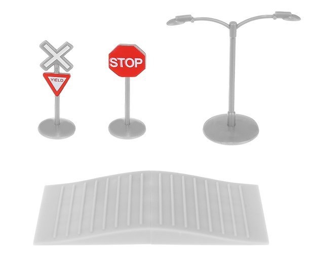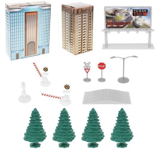 The set includes - track parts with a bridge, trains, buildings, traffic signs, and trees.