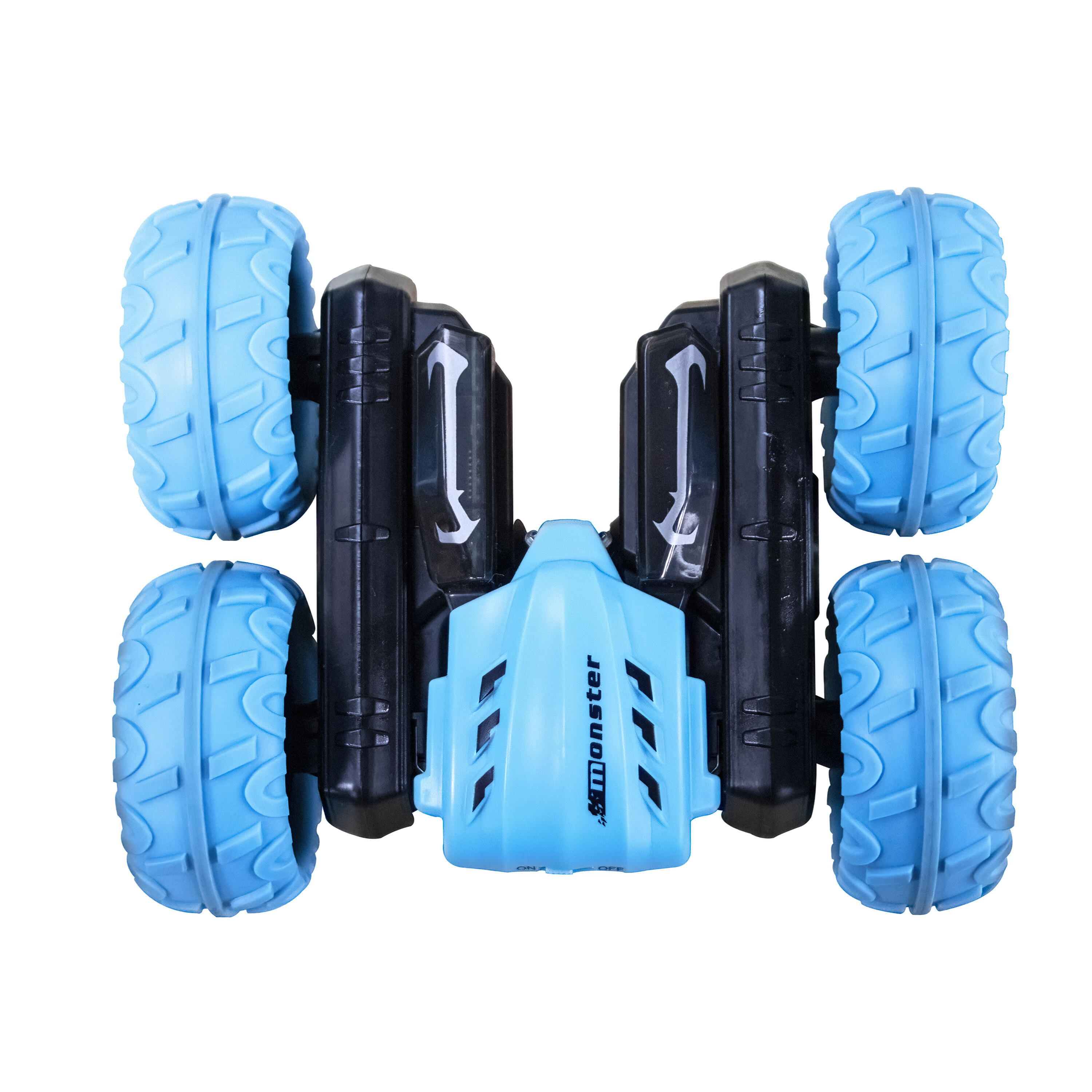 The RC double-sided car guarantees fantastic fun. The special design of this model allows for 360-degree rotation. The model can also handle any obstacle that stands in its way. It can handle various surfaces, it can ride on the floor, carpet, and even on grass. The car is equipped with extra soft rubber tires with small protrusions, ensuring that the model will firmly grip the ground.