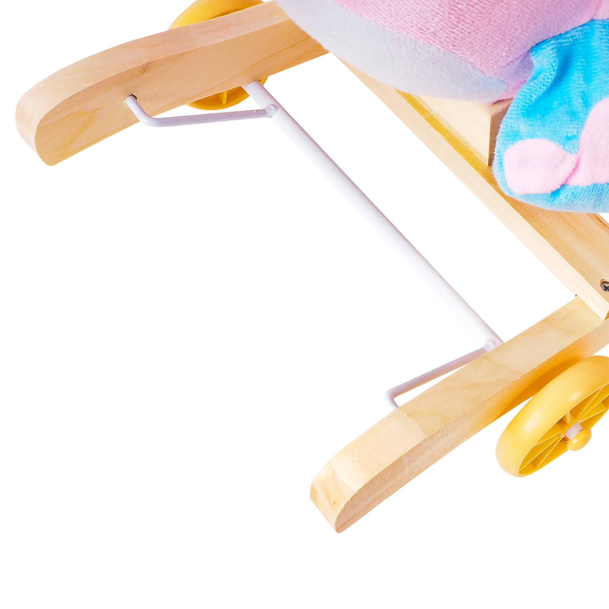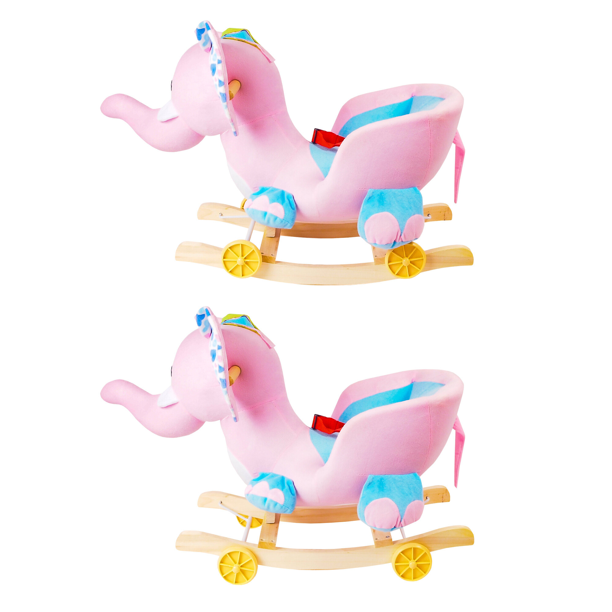 Solid wooden slats and handles help the child maintain balance. By flipping a simple mechanism on the bars, you extend the wheels, instantly transforming the rocking toy into a riding elephant.