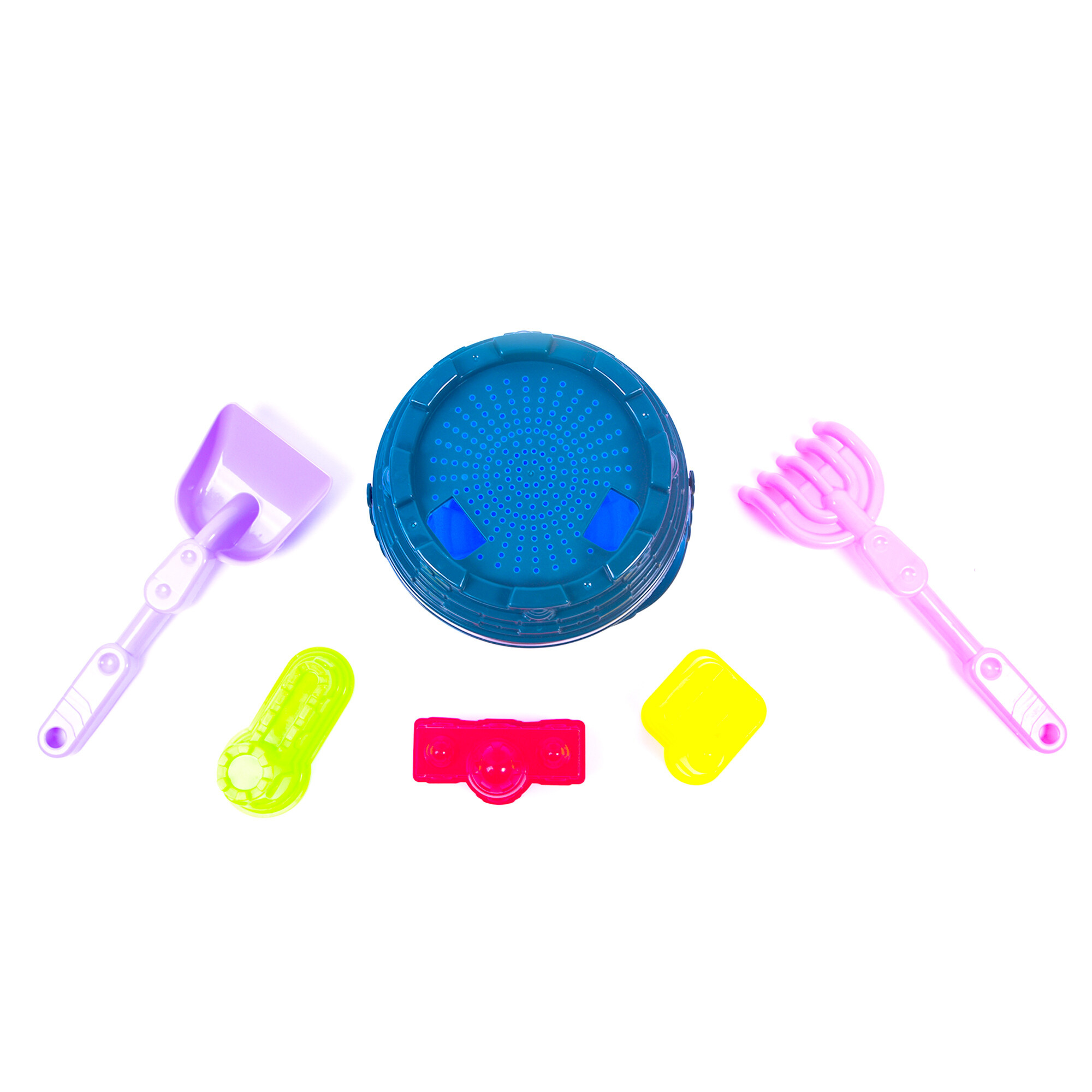 The set includes: A sieve, a shovel, a rake, a bucket, and sand molds.