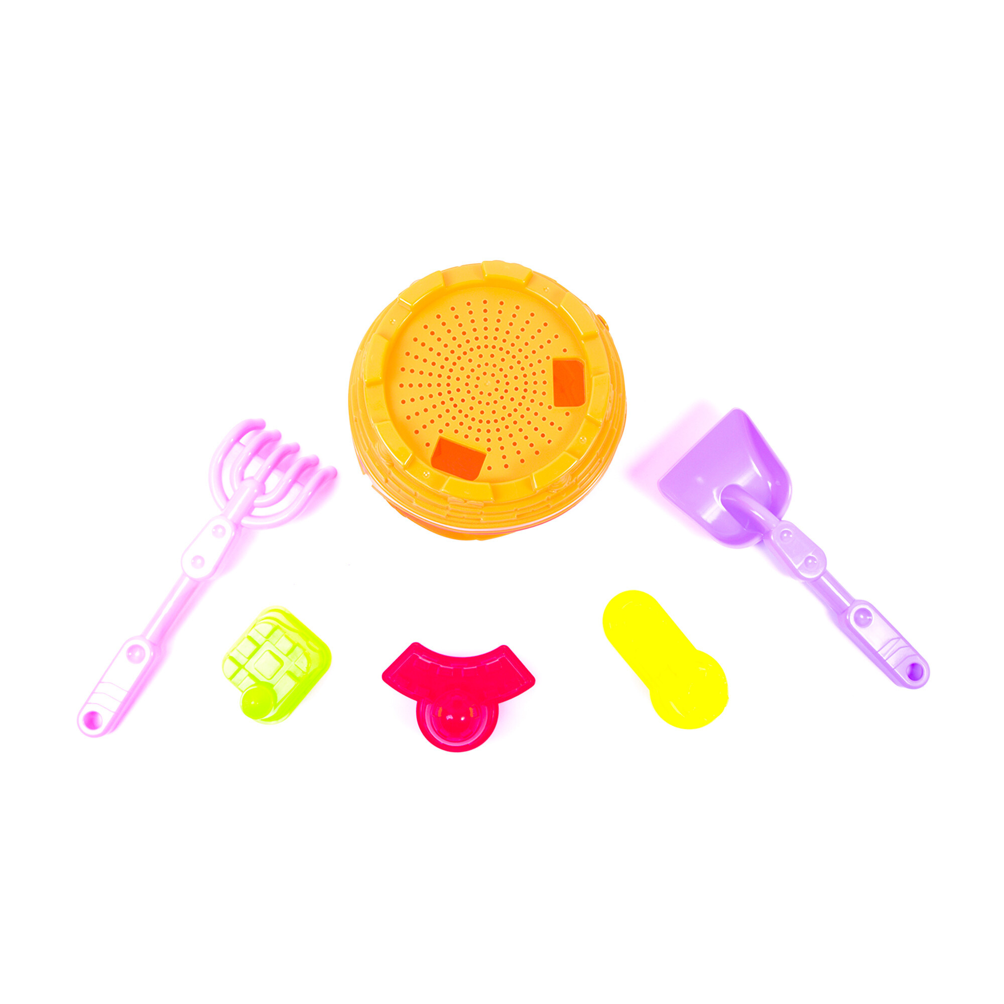 The set includes: A sieve, a shovel, a rake, a bucket, and sand molds.
