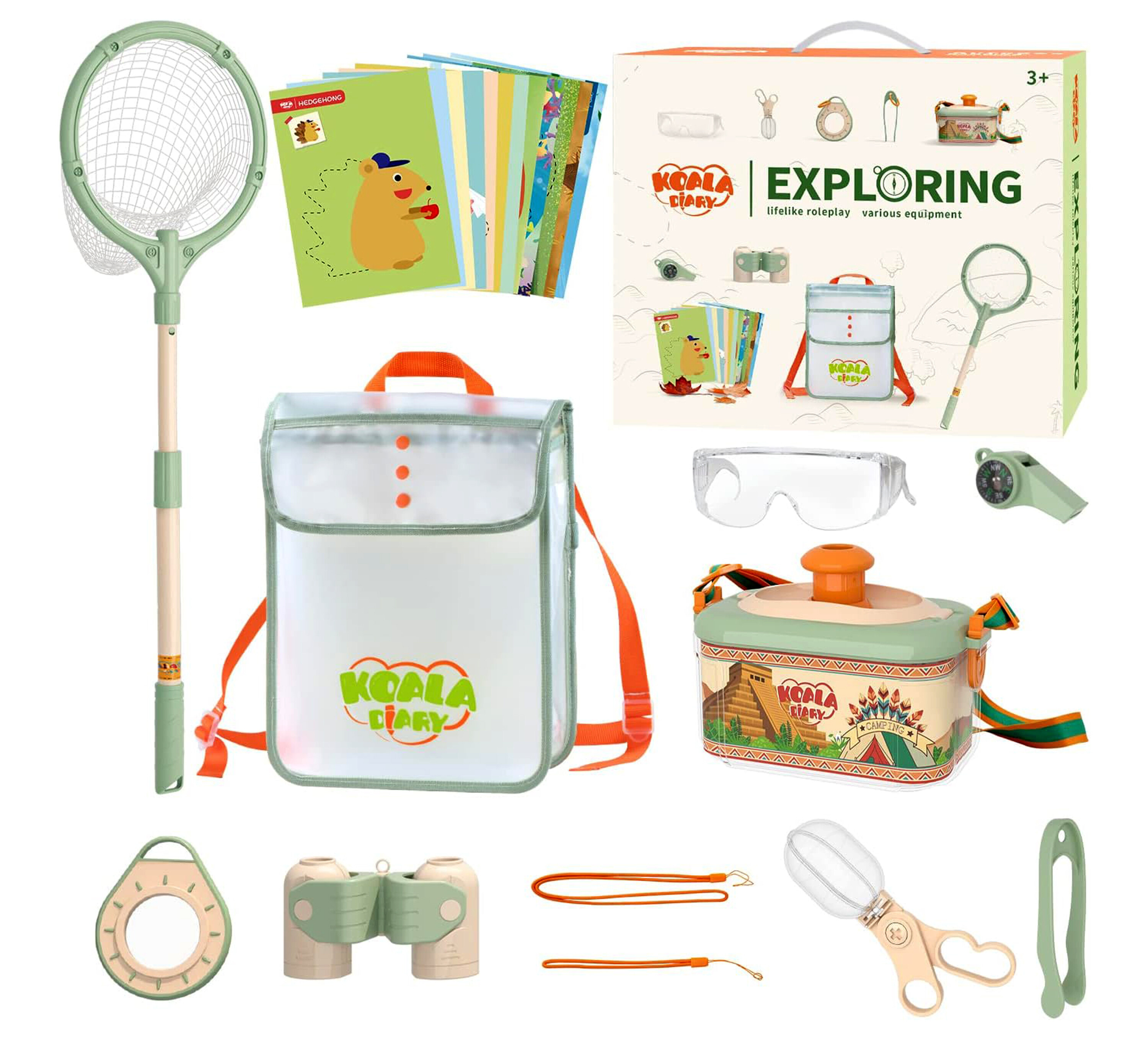 A multifunctional whistle that can also serve as a compass. Telescope with adjustable viewing angle, magnifying glass, and many other useful tools for exploring nature.The insect observation box has a movable magnifying glass, so you won't miss any insects or inanimate nature (fossils, plants, etc.).