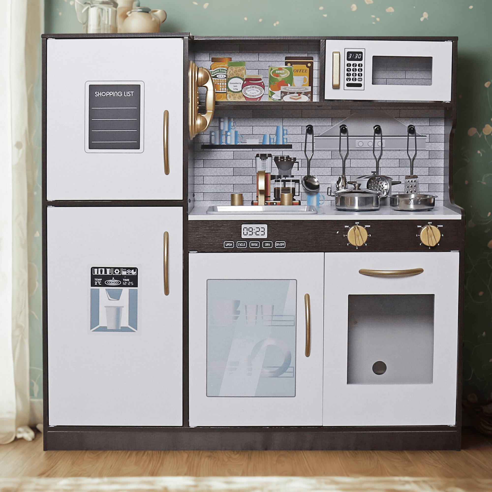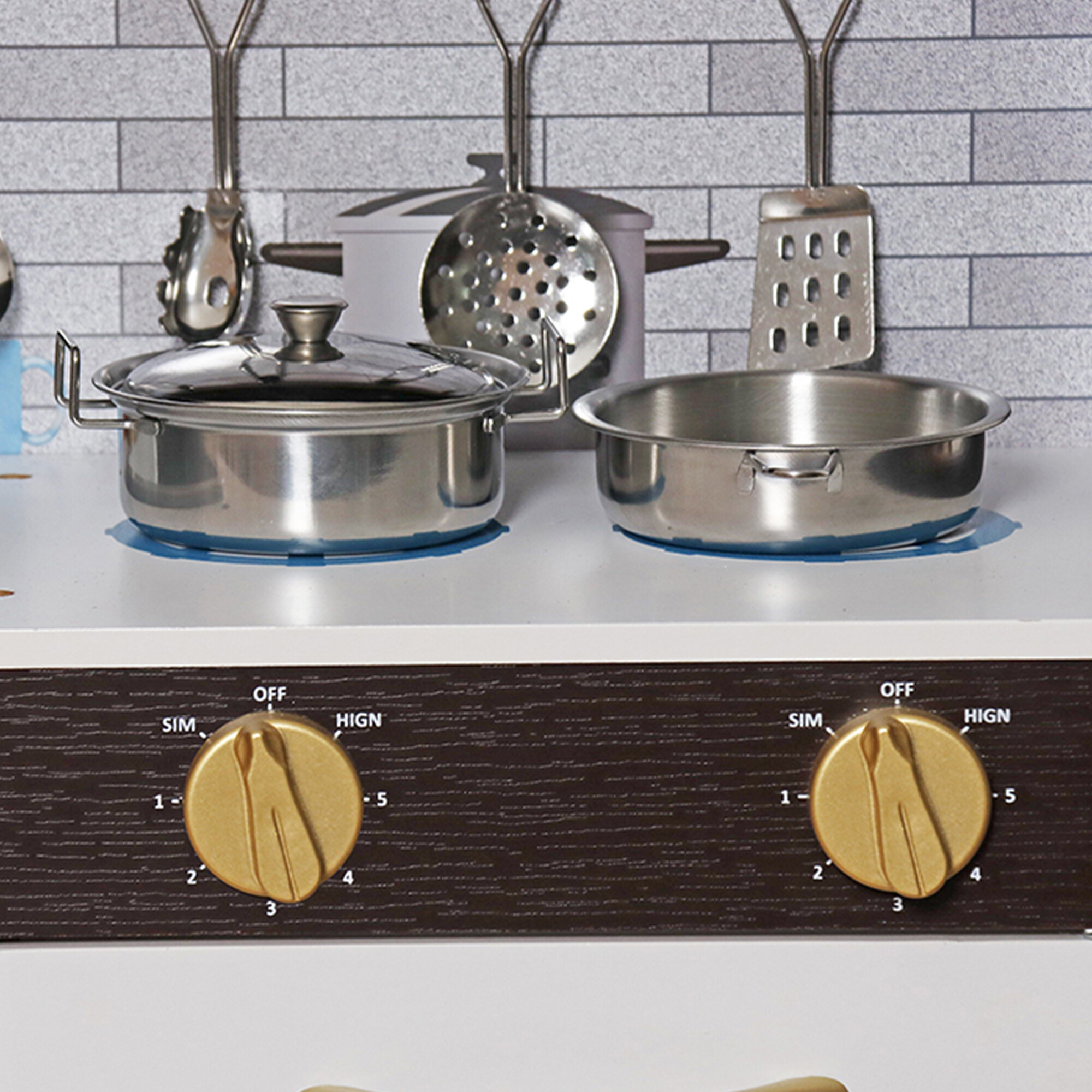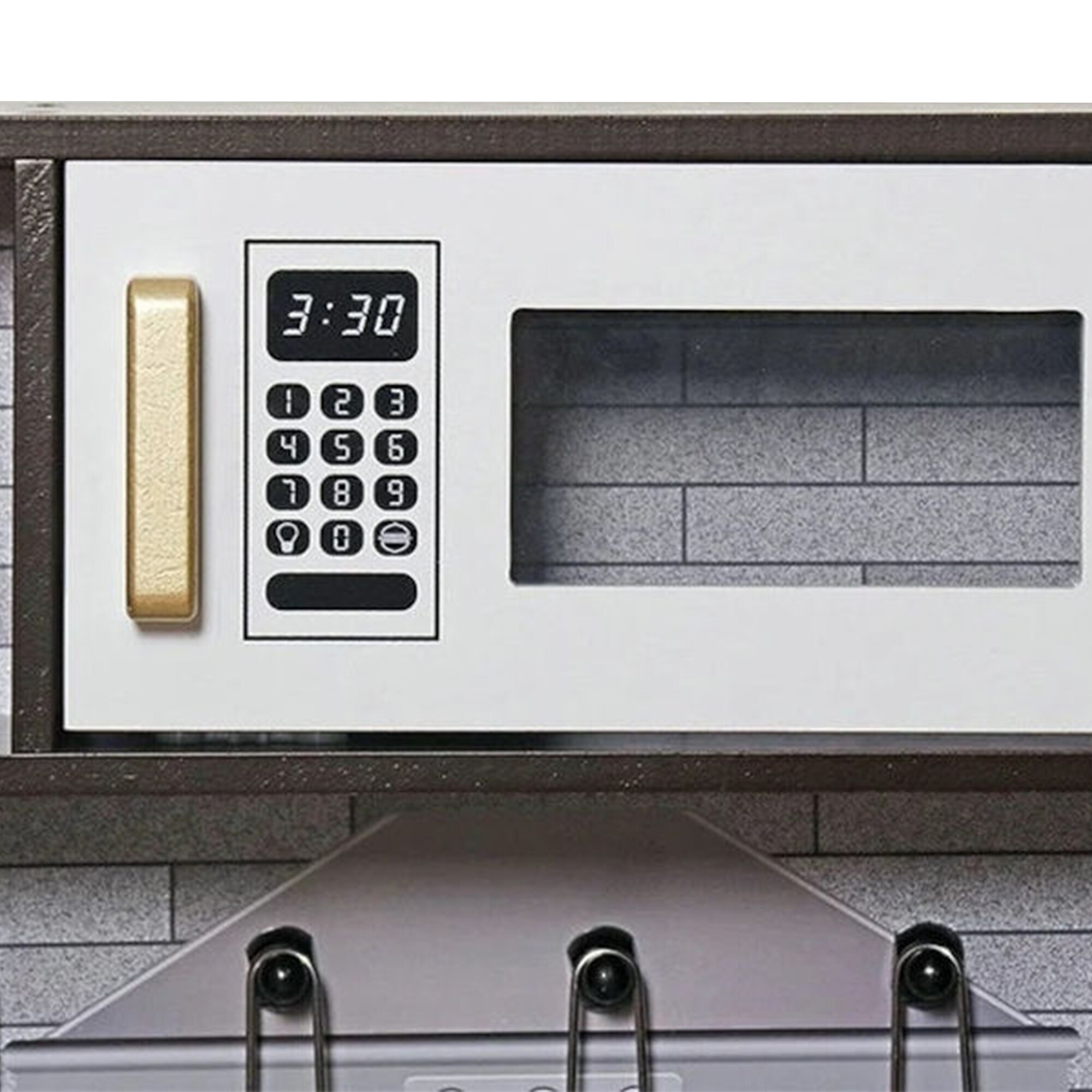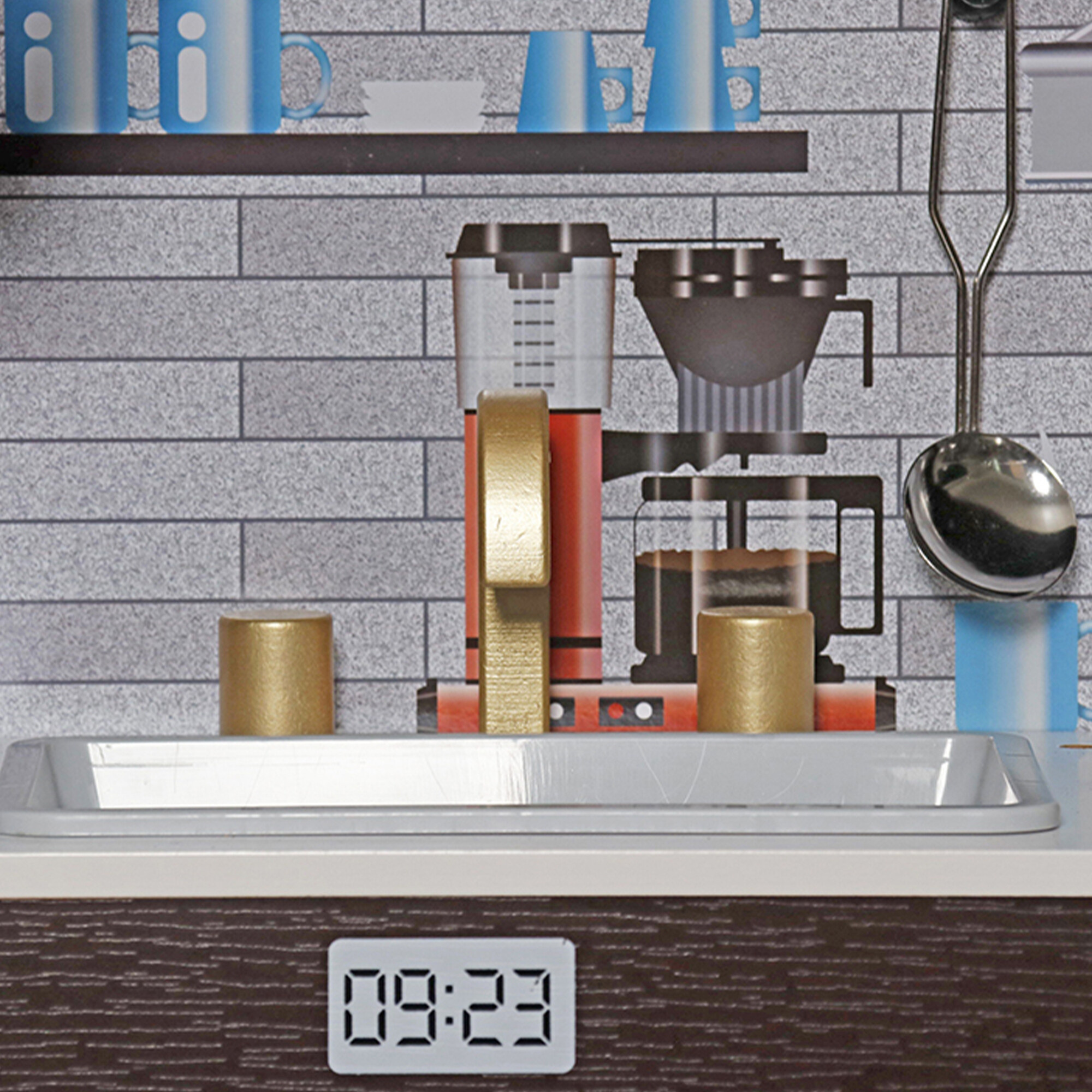 This children's kitchen model is equipped with a variety of functional elements and accessories. The kitchenette is large enough for multiple children to play with it at the same time.