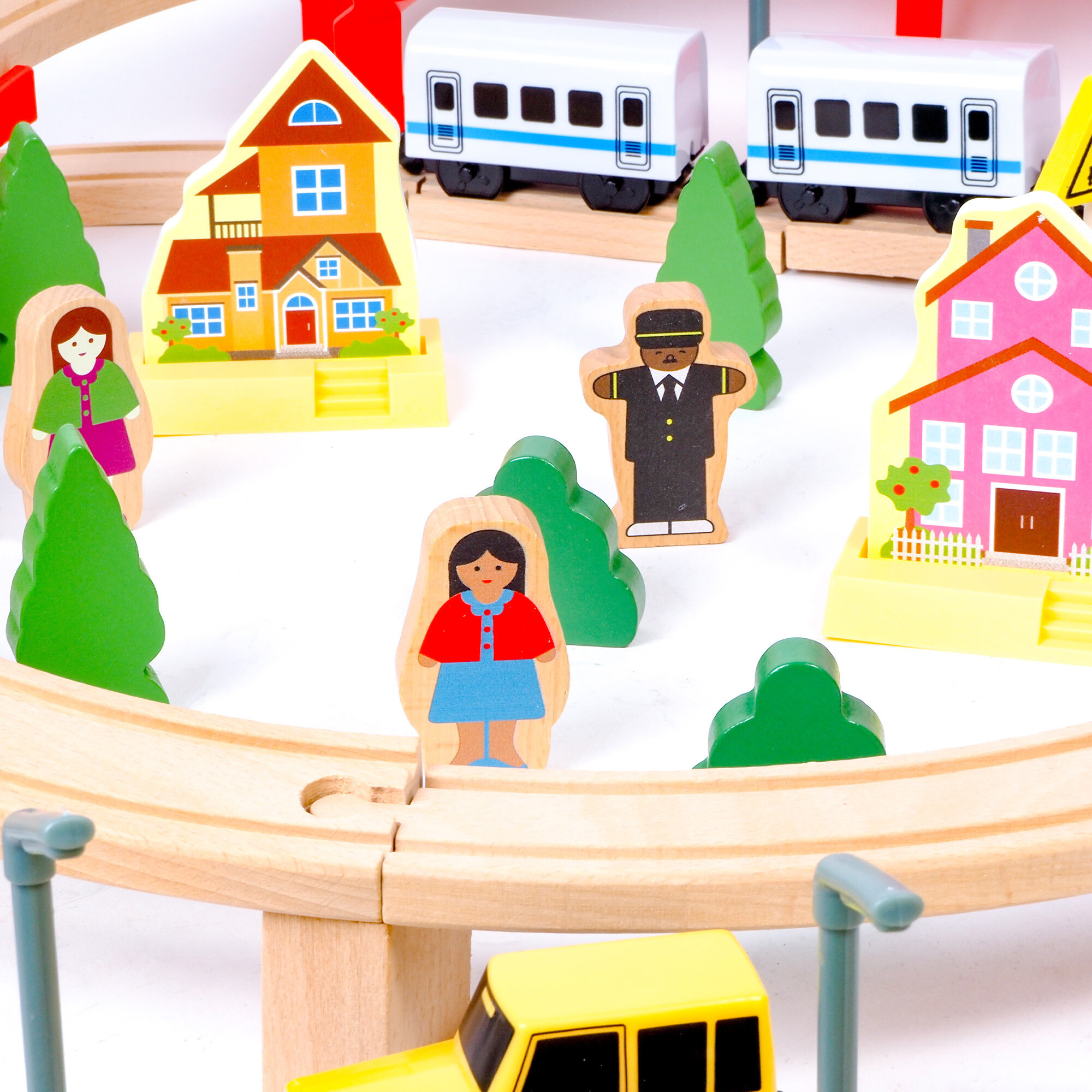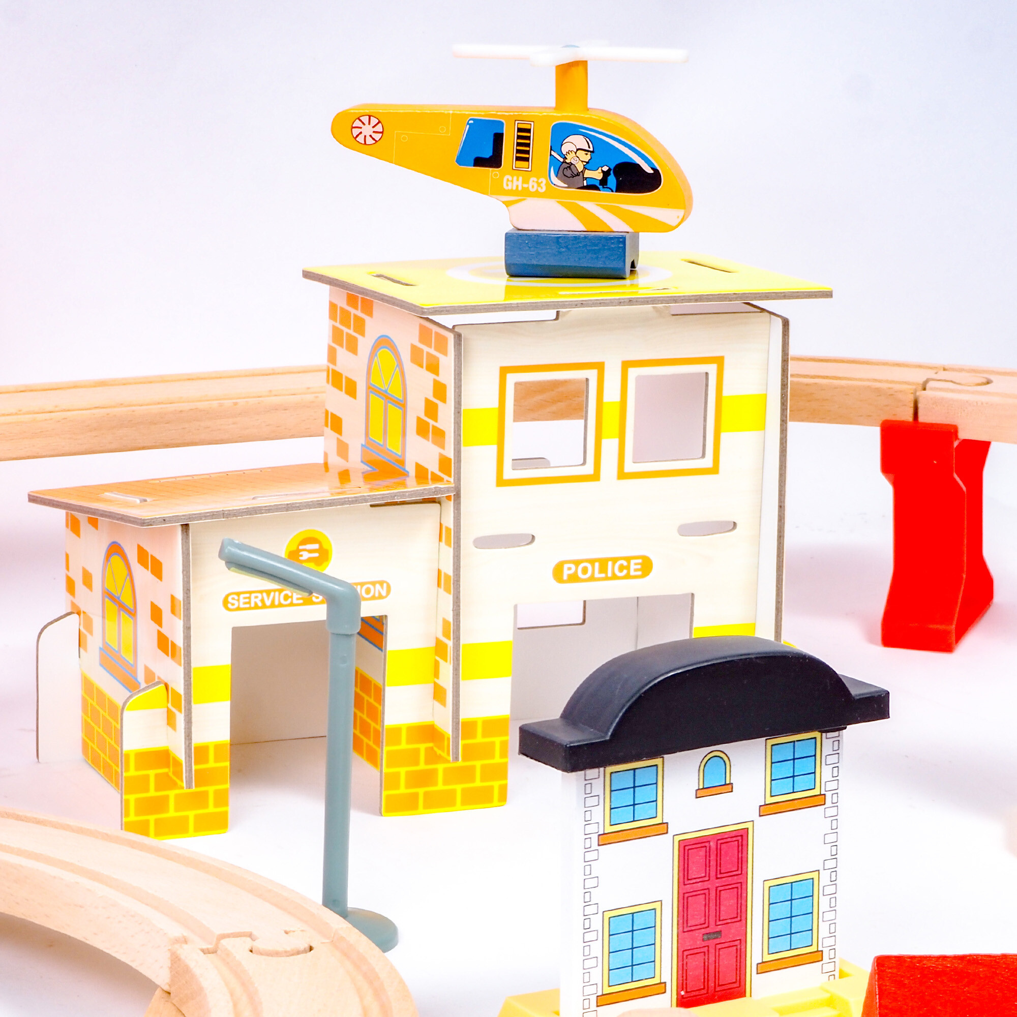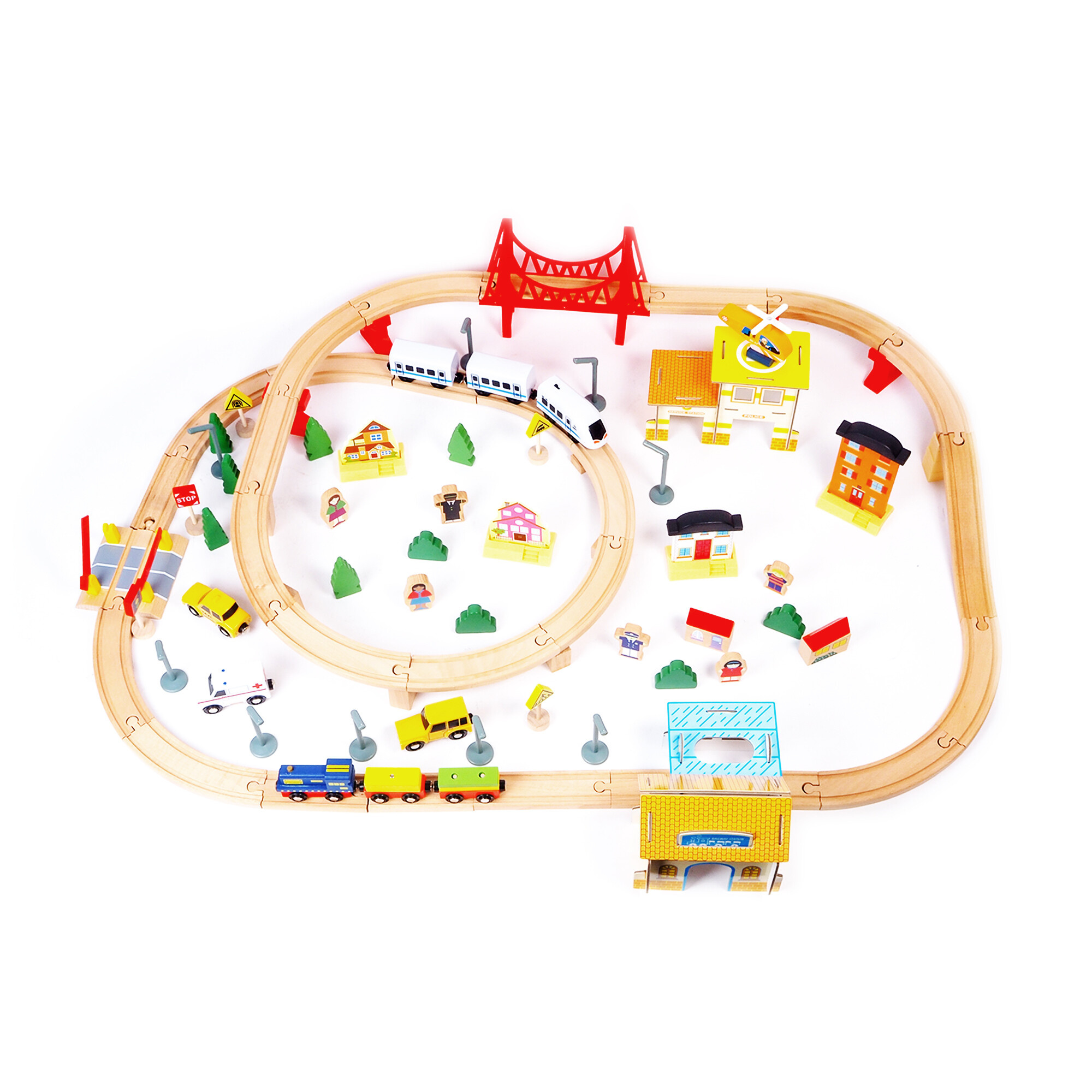 - Set includes - track parts with bridge, trains, locomotive, carriages, crossing, stop, cars, buildings, figures, traffic signs, helicopter, and trees