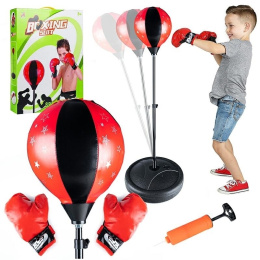 Boxing training set consisting of a punching ball on a spring and gloves. The pear is mounted on a steel boom. The attached gloves are in a universal size, suitable for a child's hand. The gloves have a cushioning layer on the knuckles. The punching ball is inflated. The set also includes a set of screws, washers, and elements necessary for its assembly. Stable base with the option to be weighted with water or sand. Dimensions: - adjustable pear height 70 - 110 cm - pear diameter: approx. 20 cm - base diameter: 33.5 cm - pump for the pear and assembly screws and key included in the set package dimensions: 47x36.5x7.5 cm Number of pieces. on the pallet: 80 Product packed in an additional box - ready for shipment.