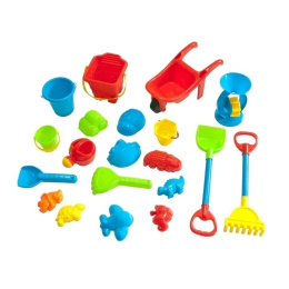 Huge, solidly crafted set made of durable plastic, 20 elements. A toy ideal for the home, garden, playground, or beach. The wheelbarrow has a movable wheel. Set composition: - wheelbarrow - 4x buckets (various sizes) - 2x shovels (large and small) - 2x rakes (large and small) - watering can - 9 different molds - sand mill