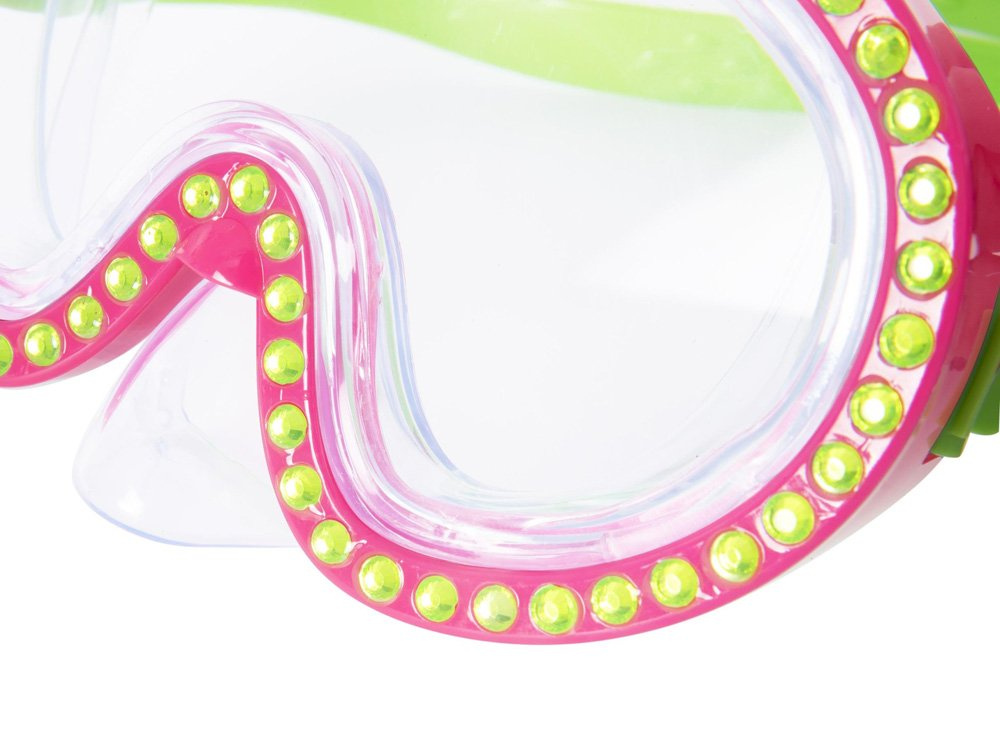 Fully adjustable head strap and double-sealed collar ensure optimal comfort during use. Additionally, the glasses have lenses with a polycarbonate UV filter. The entire piece is adorned with sparkling, embedded glittering stones. Glasses are designed for children aged 7 and above. The strap allows for complete adjustment, so the mask perfectly fits the child's head.