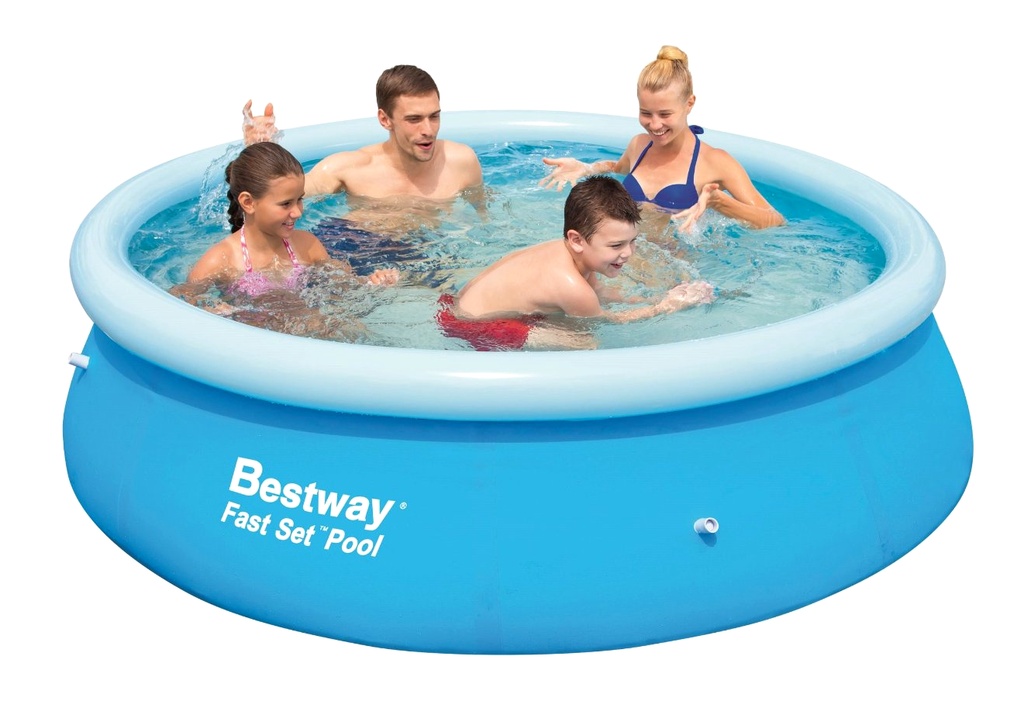 Above ground circular family garden pool, from Italian company Bestway. The pool is self-supporting, just inflate the upper ring and fill the pool with water.