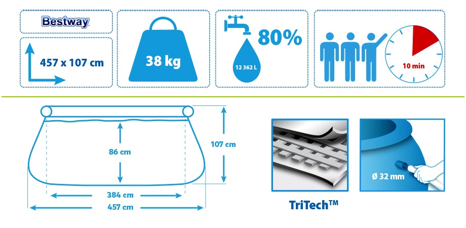 Specifications of the pool Bestway Fast Set 4,57 x 1,07 m 57294 + Cartridge filtration.