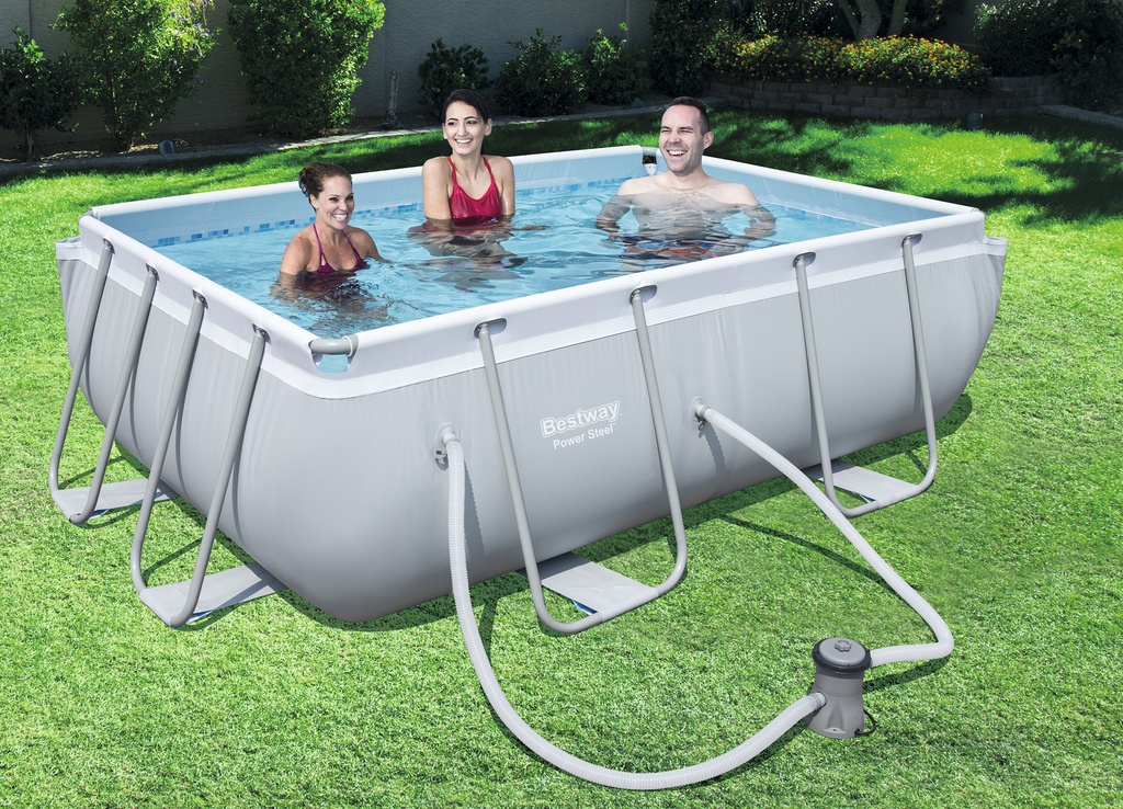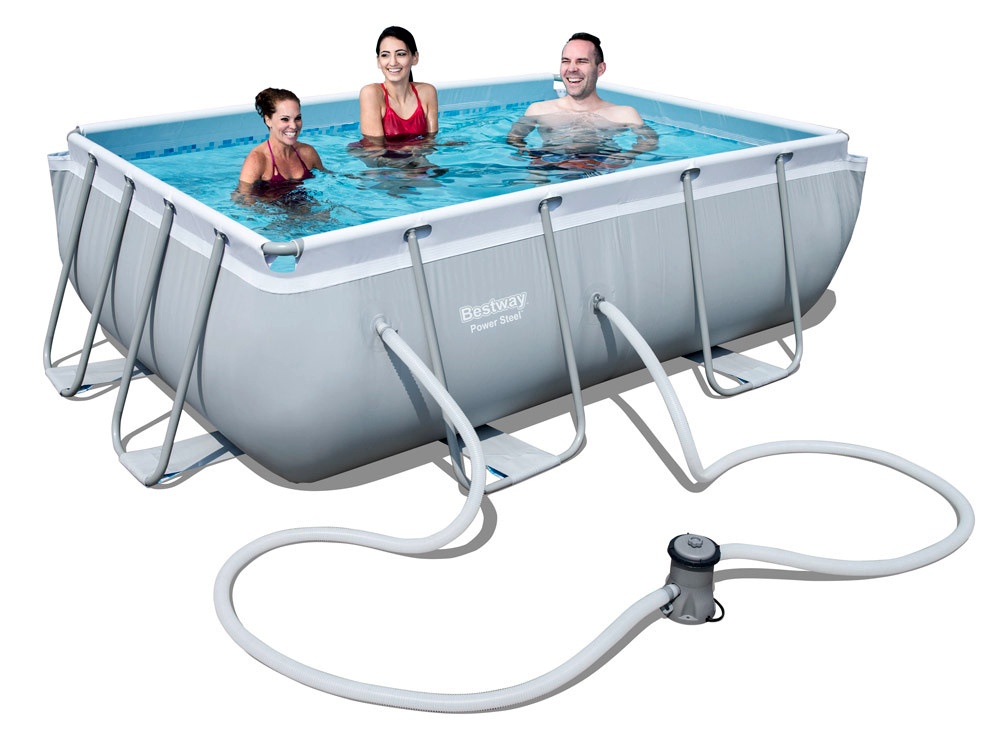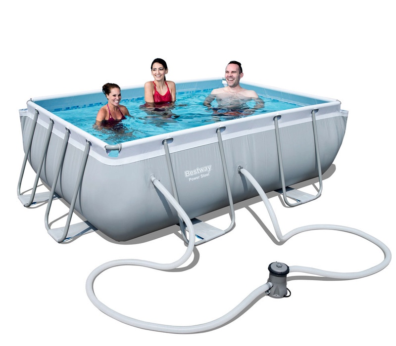 Above ground family swimming pool with metal construction from the renowned Italian company Bestway is equipped with complete accessories including cartridge filtration.