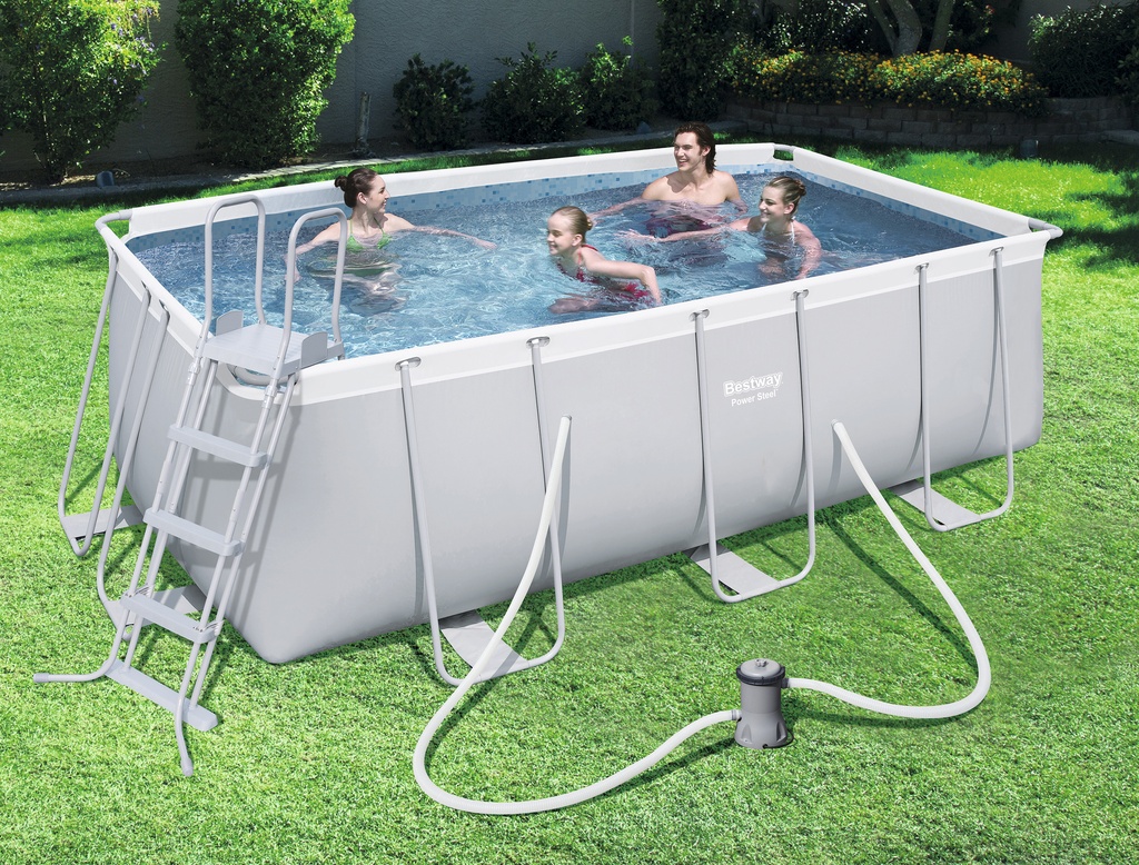 Above ground family swimming pool with metal construction from the renowned Italian company Bestway is equipped with complete accessories including cartridge filtration and pool steps.