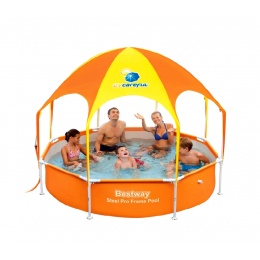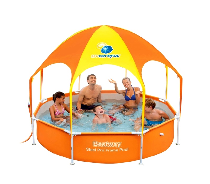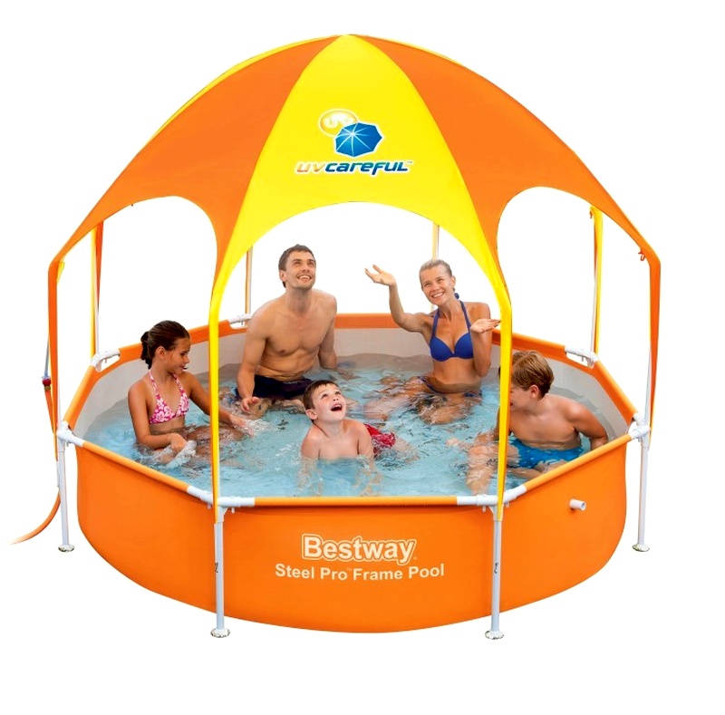 Above ground family garden pool from Italian company Bestway, with metal construction and sun canopy.