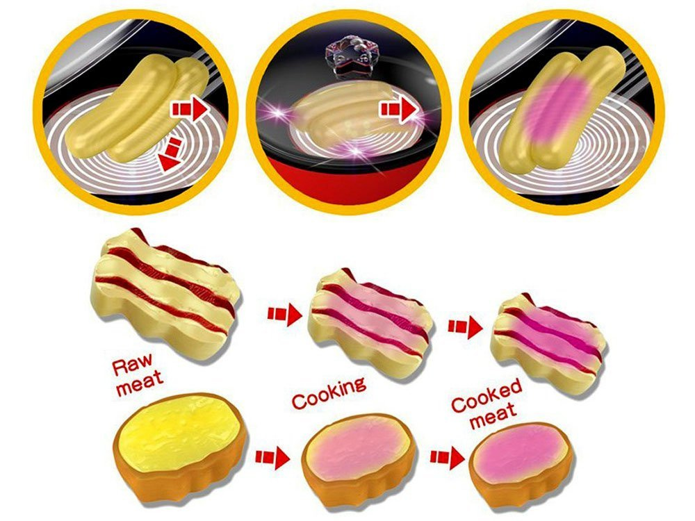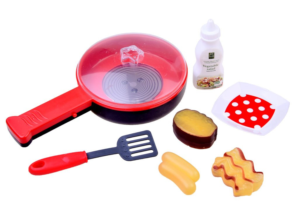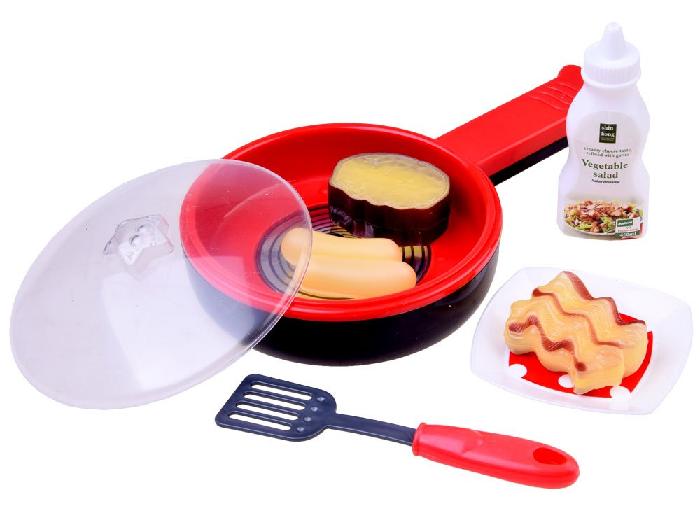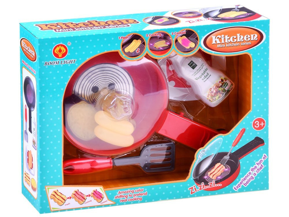 With this set, the little chef will be able to prepare a delicious steak, bacon, or crispy sausage. After pressing the button on the handle, the pan starts to light up, emitting the sound of frying treats, and additionally, the fried products change color according to the lights in the middle of the pan, making the play more realistic. The product develops imagination and manual skills and provides fun for long hours.The set includes: