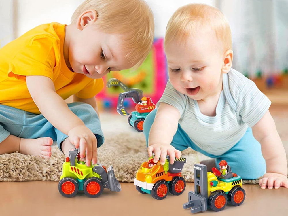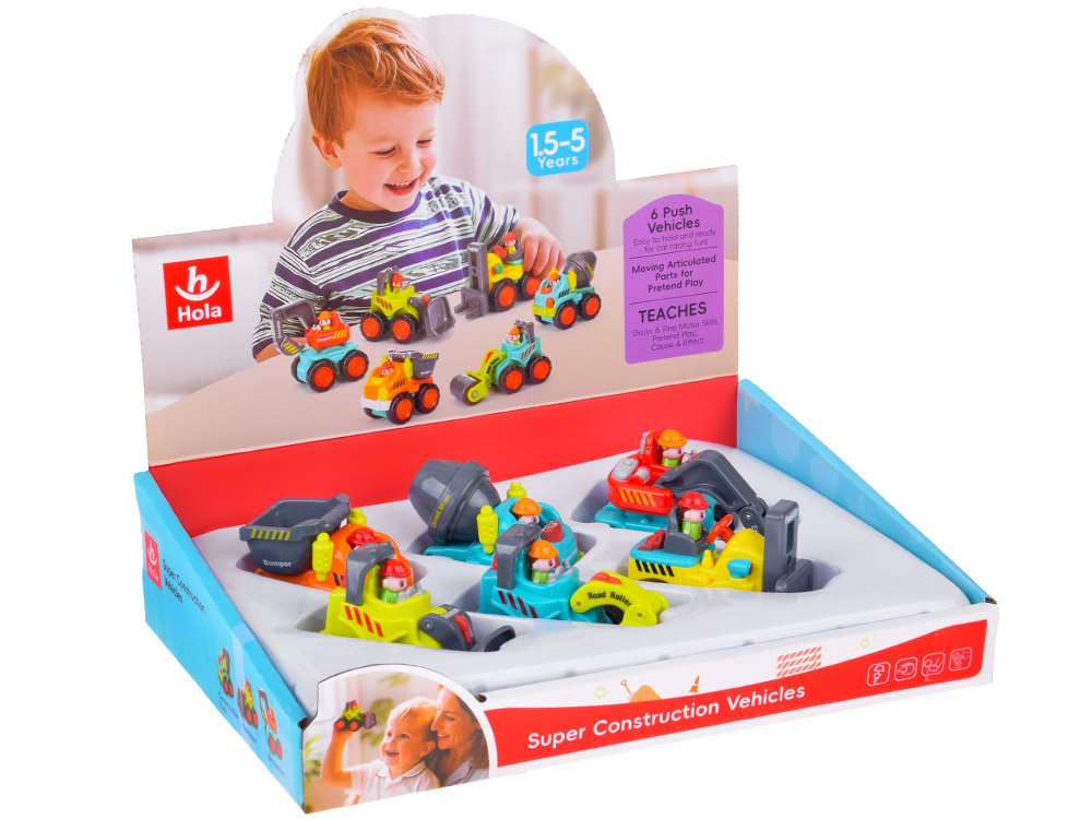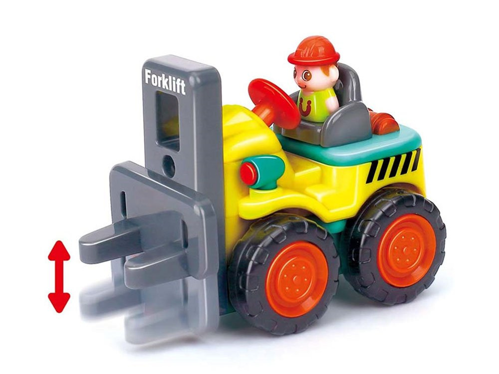 Construction play vehicle: excavator, forklift, roller, bulldozer, concrete mixer, or dump truck. A plastic toy car with movable parts is suitable for any game.