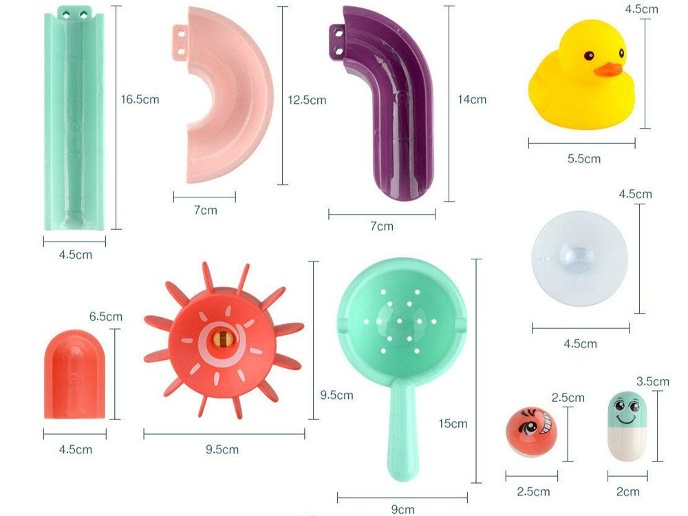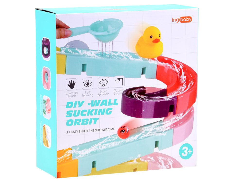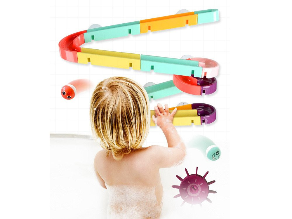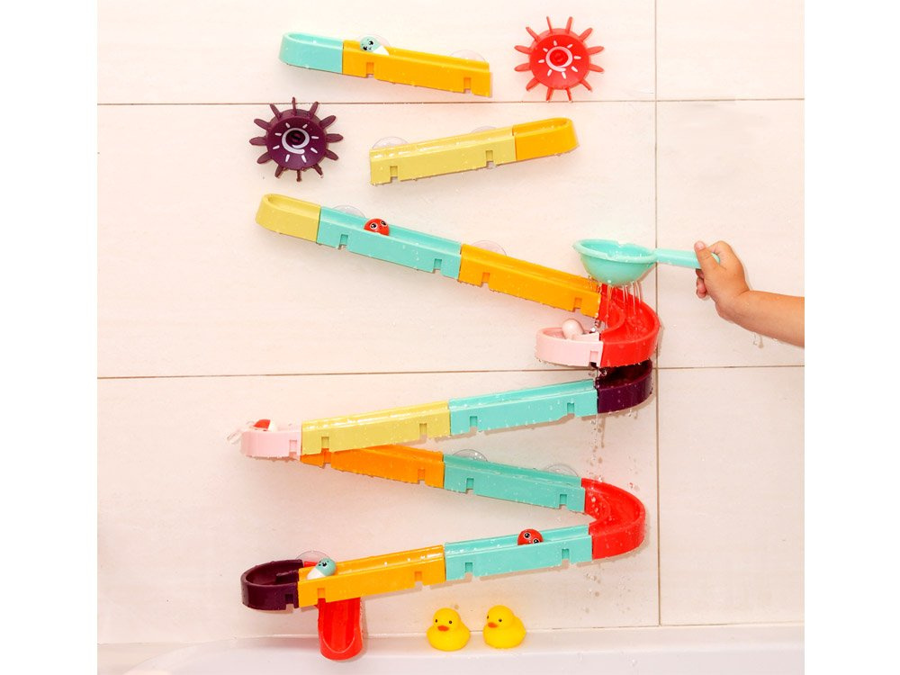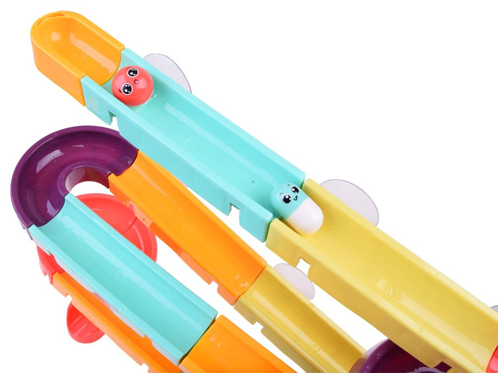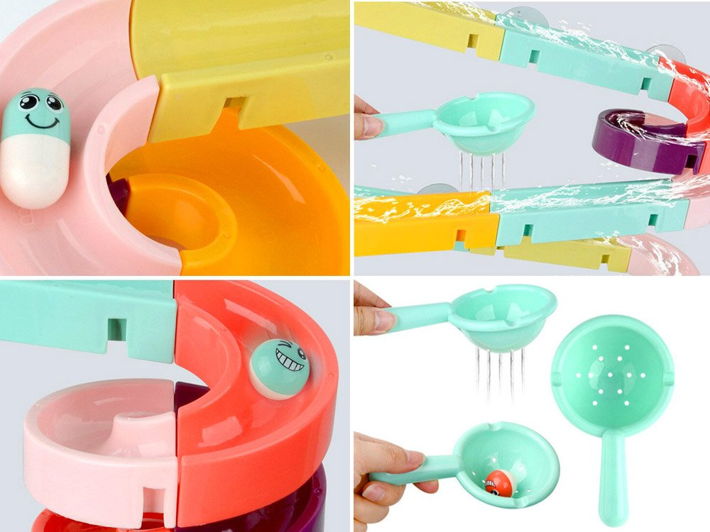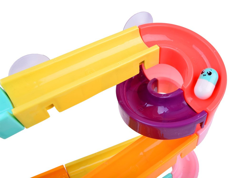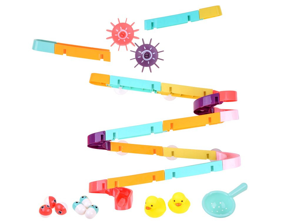 The set is made of plastic and has silicone suction cups so that the track can be attached to the tiles in the bathroom. Included in the package are coloured pieces to build a spiral track, rubber ducks, balls, beans and a strainer. When bathing, the child can invent fantastic games with a fleeing duck, a chasing ball and rollers that can be stuck side by side so that the child can spin both at the same time. The set consists of 44 pieces from which you can build a slide.